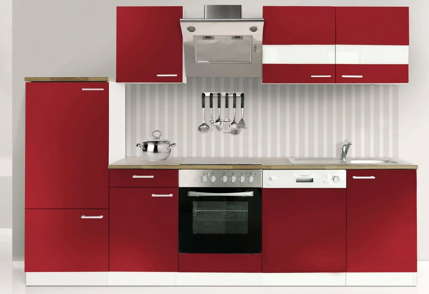 Küchenzeile – Gesamtbreite 280 cm. In 3 aktuellen Farbvarianten. Mit einem Einbaugeräte – Set in Edelstahl. Durchgehende Arbeitsplatte ohne Ausschnitte für Herd und Spüle, dadurch variabel zu stellen. Einbauspülbecken aus rostfreiem Edelstahl, Arbeitsplatte in Nussbaum-Buttcherblock 220 cm breit ohne Ausschnitte für Herd und Spüle, dadurch variabler Aufbau möglich. Hänge- und Unterschränke mit je einem Einlegeboden (außer Spülschrank), Schränke innen weiß. Metall-Stangengriffe in Edelstahl-Look. Alle Schubkästen und Türen mit Softclosefunktion (außer Kühlschranktür). Schubkästen auf leichtgängigen Metallschienen. Fronten und Korpus mit pflegeleichter Kunststoffoberfläche. Korpus weiß, Fronten wahlweise in weiß, rot, grau oder schwarz erhältlich. Für diese Küche können Sie einen separaten Aufbauservice mit der Bestellnummer 895226 zum Festpreis hinzubuchen.