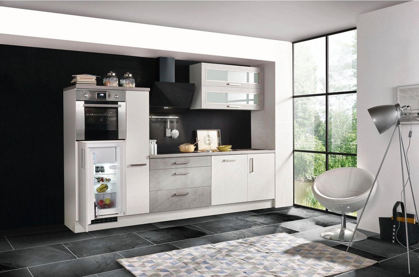 Schick und praktisch: Die Küchenzeile »Lier« von RESPEKTA mit viel Stauraum setzt in deinem Zuhause einen gelungenen Einrichtungsakzent. Optisch begeistert der Küchenblock durch seine klaren Formen und die moderne Dekorwahl. Unterstrichen wird das Erscheinungsbild durch die Glaseinsätze bei den Oberschränken sowie die silberfarbenen Griffe. Neben den zahlreichen Stauraummöbeln ist im Lieferumfang auch schon ein Elektrogeräte-Set enthalten. Zu dieser Einbauküche gehören ein Backofen, ein Kühlschrank sowie eine Abzugshaube. Auch eine passende Edelstahlspüle wird mitgeliefert. Besonders praktisch ist auch die Soft-Close-Funktion. Passt zu unterschiedlichen Wohnkonzepten: die Küchenzeile »Lier« von RESPEKTA mit viel Stauraum.