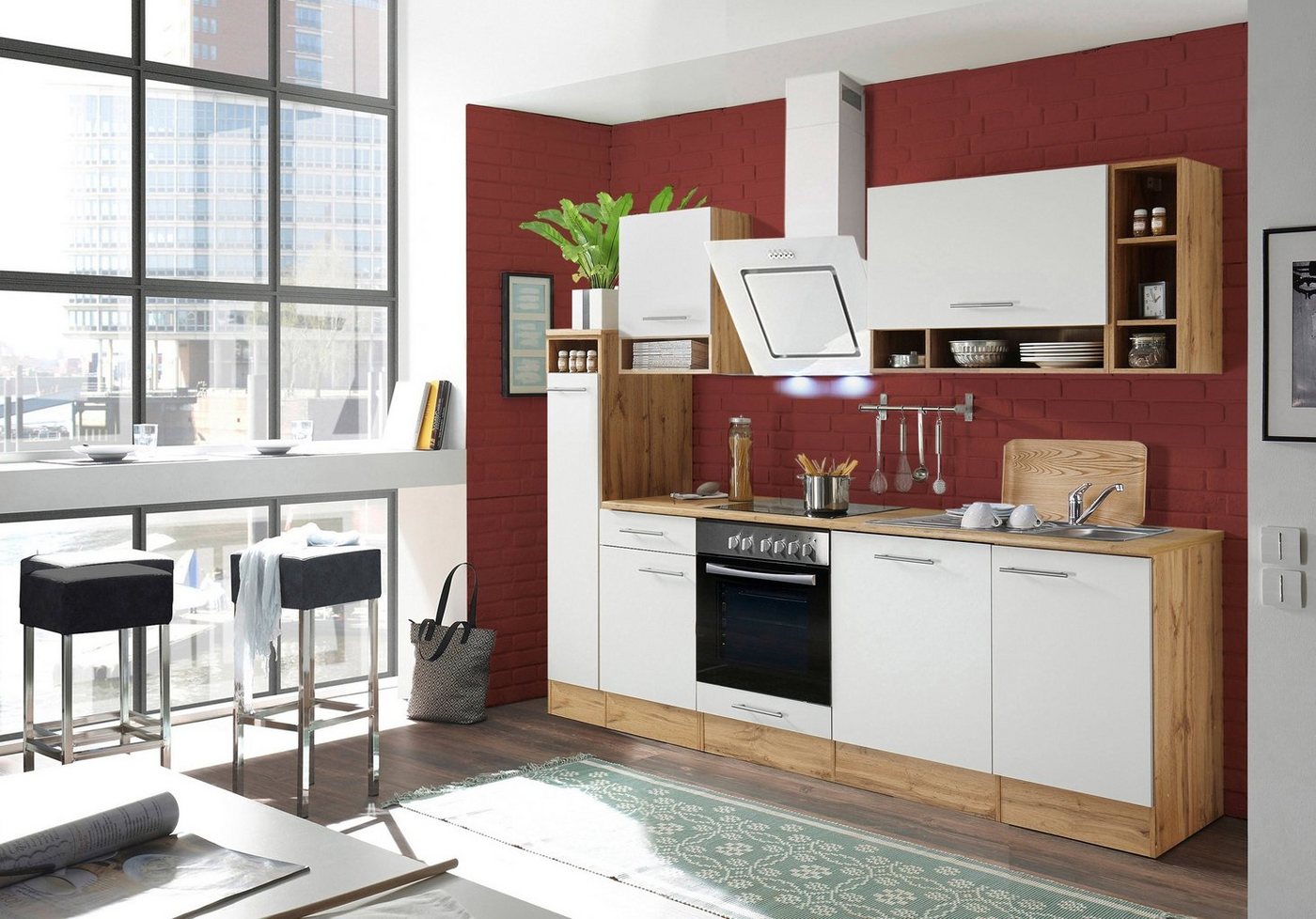 Die 250 cm breite Küche »Lübeck« kombiniert schlichte Eleganz mit modernem Komfort. Der rustikal wirkende Wildeiche-Korpus steht in schönem Kontrast zu den trendig grauen oder weißen Fronten. Ausgestattet mit modernen und energiesparenden Elektrogeräten und Soft-Close-Scharnieren, lässt diese Küche keine Wünsche offen. Dank der geräumigen Schränke mit Stangengriffen aus Metall finden sich vielfältige Stauraummöglichkeiten für Vorräte und Küchenutensilien. Das Einbauherdset mit Glaskeramikkochfeld und die moderne Schräghaube sorgen für größtmögliches Back- und Kochvergnügen. Und da der vollintegrierte und energieeffiziente Geschirrspülers den Abwasch übernimmt, lässt sich stattdessen der Abend in Ruhe genießen.