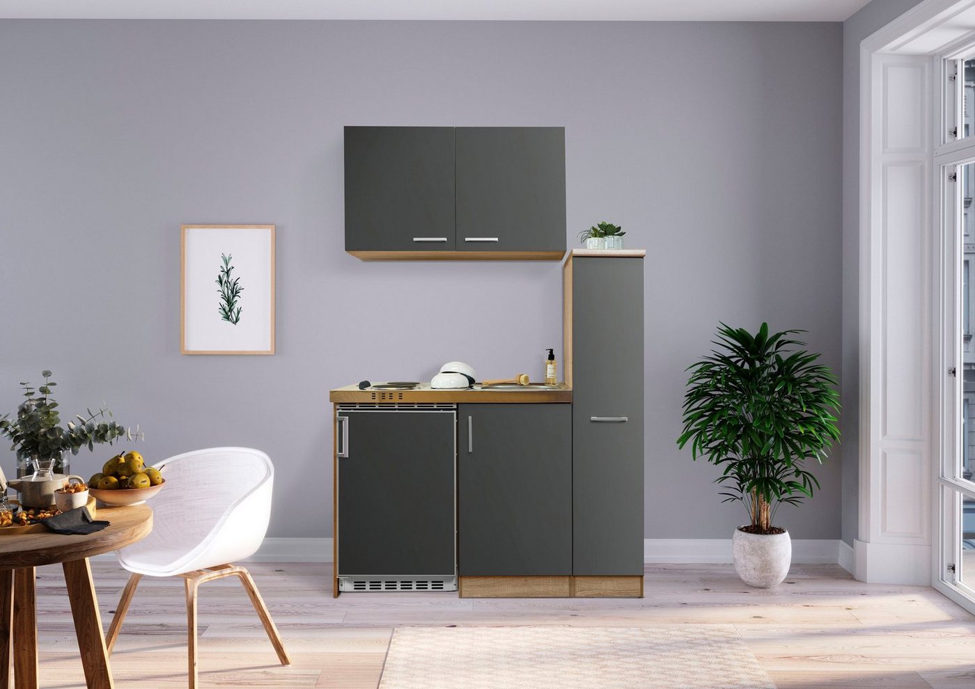 Macht das Kochen auch in den kleinsten Räumlichkeiten möglich. Pantryauflage aus rostfreiem Edelstahl. Hänge mit je einem Einlegeboden, Schränke innen weiß. Alle Schränke mit pflegeleichter Kunststoffoberfläche. Die Miniküche ist wechselseitig montierbar.