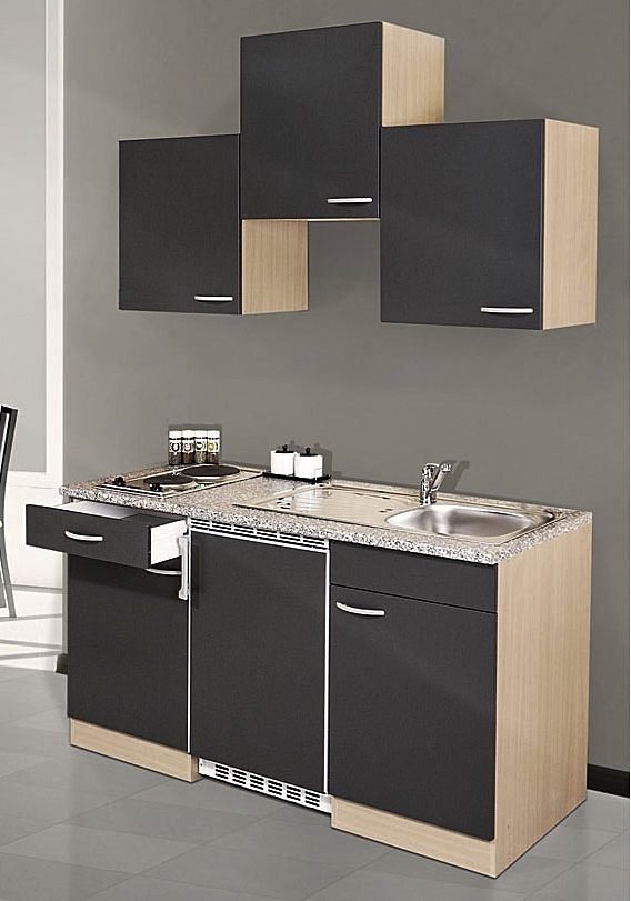 Macht das Kochen auch in den kleinsten Räumlichkeiten möglich. 8 x 4 Edelstahlspüle. Hängeschränke mit je einem Einlegeboden, Schränke innen weiß. Alle Schränke mit pflegeleichter Kunststoffoberfläche.