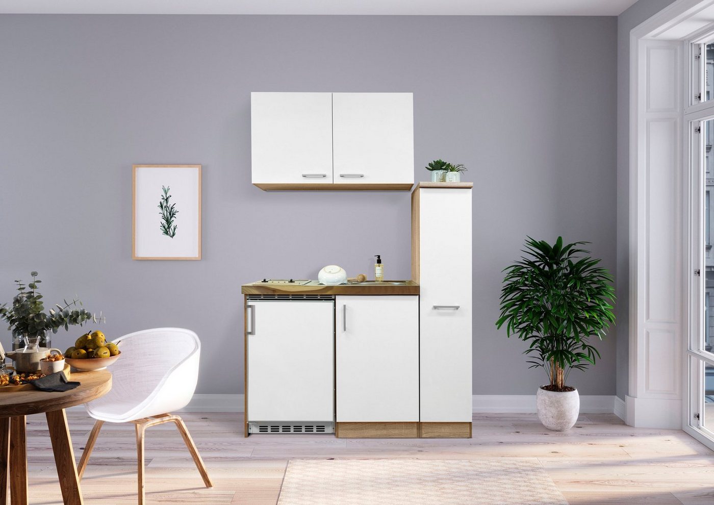 Kleiner Raum, großes Kochvergnügen! Die Miniküche mit einer Breite von 130 cm hat alles, was man zum Kochen braucht: Kochfeld, Kühlschrank und Spüle machen aus der Miniküche ein Maxihighlight. Besonders praktisch für kleine Räume: Der Apothekerschrank lässt sich nach vorne ausziehen und braucht so besonders wenig Platz. Die Küchenzeile ist in vier hübschen Farbvarianten erhältlich.