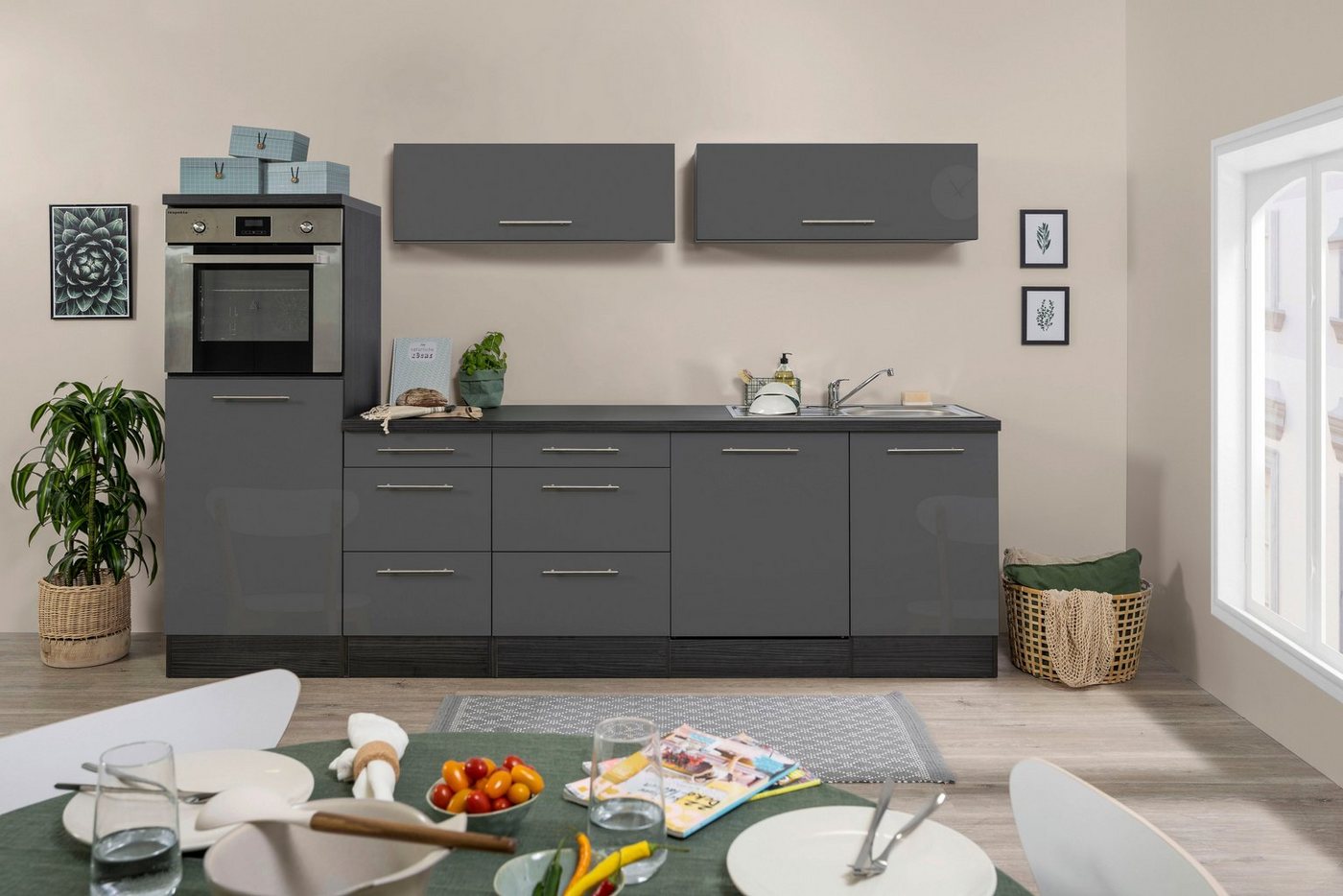 Die moderne Küchenzeile »RP280« mit E-Geräten aus dem Hause RESPEKTA überzeugt mit einem eleganten Design. Sie ist geradlinig gestaltet, was gut zu vielen Wohnkonzepten passt. Ihre eleganten Hochglanzfronten aus Holzwerkstoff sind in mehreren attraktiven Farben verfügbar, womit du die Optik der Einbauküche an deine Einrichtung anpassen kannst. Schlanke Stangengriffe aus Metall komplettieren den trendigen Look. Die Arbeitsplatte hat eine ergonomische Arbeitshöhe, was dich bei allen Arbeiten optimal unterstützt. Mit Ausnahme der Kühlschranktür weisen alle Auszüge und Scharniere eine Soft-Close-Funktion auf. Mit der modernen Küchenzeile »RP280« mit E-Geräten aus dem Hause RESPEKTA richtest du deine Wohnung stilvoll und praktisch ein.