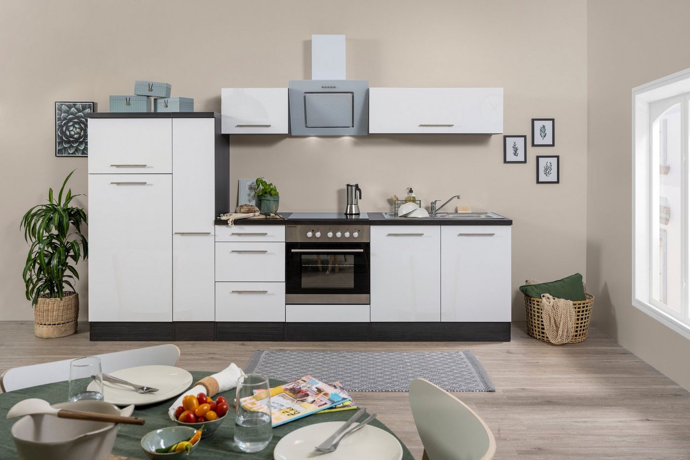 Die Küchenzeile »RP300« mit E-Geräten aus dem Hause RESPEKTA bietet dir viele Funktionen und eine Menge Stauraum für Geschirr und Lebensmittel. Sie ist geradlinig und schlicht gestaltet. Ihr moderner Look wird durch Hochglanzfronten aus Holzwerkstoff unterstrichen. Dazu passen die eleganten Stangengriffe aus Metall an den Türen und Schubladen. Mit Ausnahme von Kühlschranktür und Apothekerschrank besitzen alle Auszüge und Scharniere eine komfortable Soft-Close-Funktion. Die Arbeitsplatte weist eine ergonomische Arbeitshöhe auf. Mit der Küchenzeile »RP300« mit E-Geräten aus dem Hause RESPEKTA richtest du deine Küche geschmackvoll ein.
