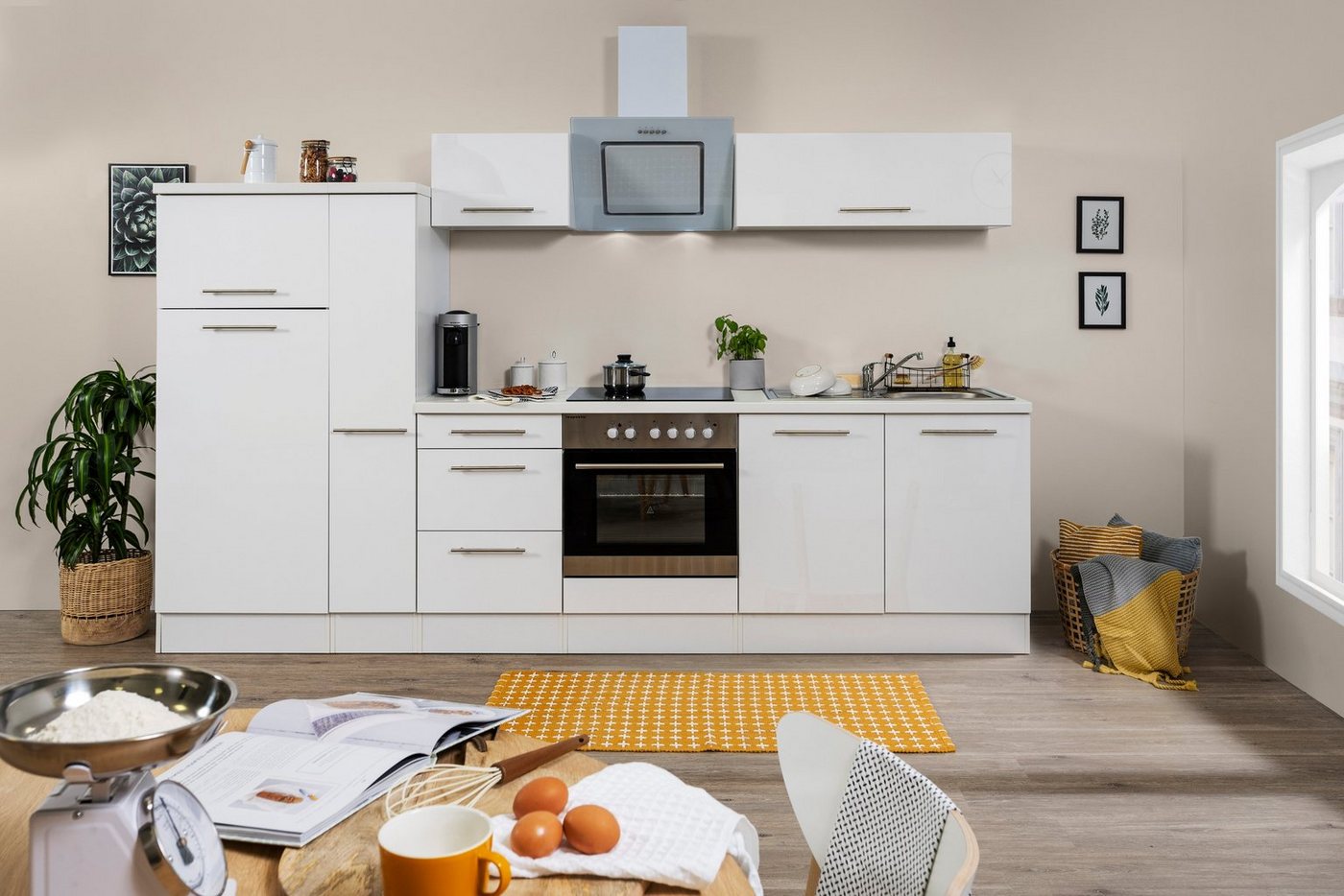 Die Küchenzeile »RP300« mit E-Geräten aus dem Hause RESPEKTA bietet dir viele Funktionen und eine Menge Stauraum für Geschirr und Lebensmittel. Sie ist geradlinig und schlicht gestaltet. Ihr moderner Look wird durch Hochglanzfronten aus Holzwerkstoff unterstrichen. Dazu passen die eleganten Stangengriffe aus Metall an den Türen und Schubladen. Mit Ausnahme von Kühlschranktür und Apothekerschrank besitzen alle Auszüge und Scharniere eine komfortable Soft-Close-Funktion. Die Arbeitsplatte weist eine ergonomische Arbeitshöhe auf. Mit der Küchenzeile »RP300« mit E-Geräten aus dem Hause RESPEKTA richtest du deine Küche geschmackvoll ein.
