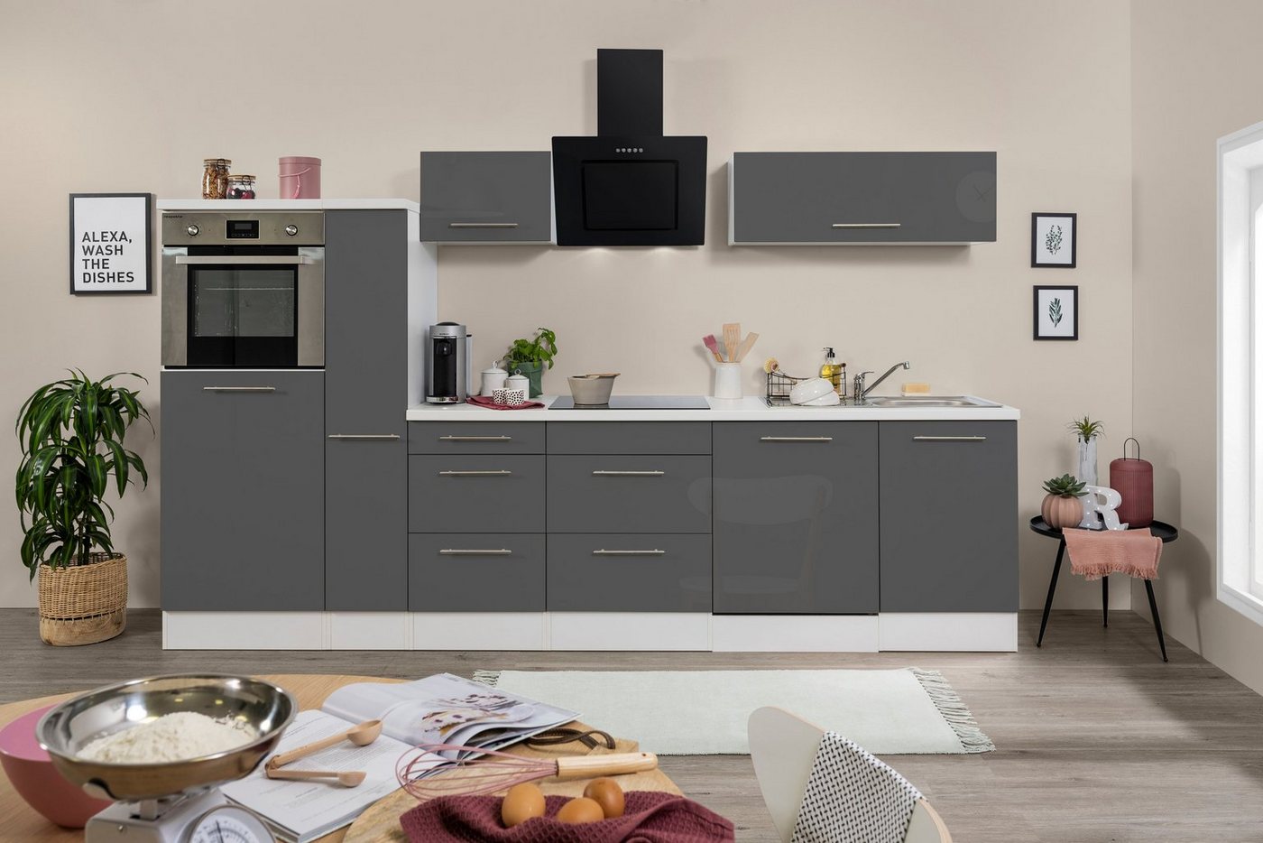Überzeugt durch ihr modernes Design und funktionale Ausstattungsmerkmalen: die Küchenzeile »RP310« aus dem Hause RESPEKTA. Die edle Optik wird durch Hochglanzfronten in Verbindung mit formschönen Stabgriffen aus Metall geprägt. Der Küchenblock ist mit allen benötigten Umbauschränken ausgestattet, um die zugehörigen E-Geräte zu integrieren. Reichlich Stauraum steht dir innerhalb der Hängeschränke sowie in Unterschränken mit Auszügen zur Verfügung. Ideale Voraussetzungen, um Küchenutensilien, Lebensmittelvorräte und weitere Dinge unterzubringen. Dank einer integrierten Soft-Close-Funktion schließen die Türen, Klappen und Schubladen besonders leise. Mit der Küchenzeile »RP310« von RESPEKTA stattest du deine Küche auf eine moderne und zugleich funktionale Art aus.