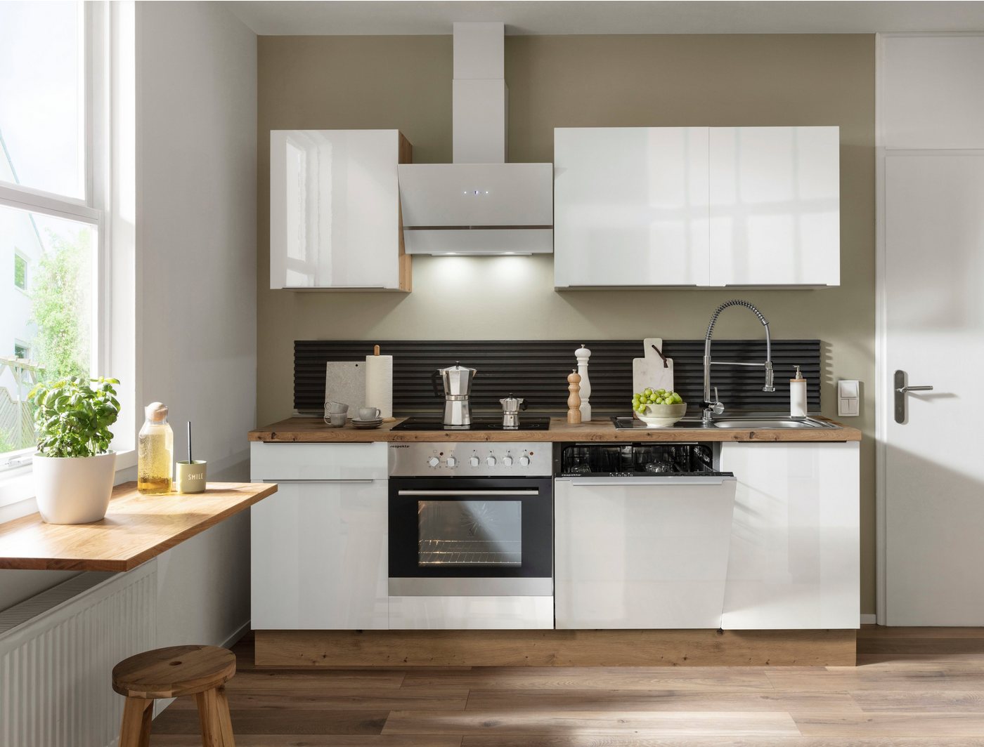 Die Küchenzeile »Safado« mit E-Geräte-Set aus dem Hause RESPEKTA beeindruckt mit einem modernen Erscheinungsbild. Sie ist in mehreren Farbkombinationen erhältlich und unterstreicht mit stilvollen Griffleisten in Alu-Optik den edlen Look der Möbel. Die Türen dieses Küchenblocks schließen dank der integrierten Soft-Close-Funktion mühelos und leise. Höhenverstellbare Füße gleichen eventuelle Unebenheiten des Bodens aus. Besonders komfortabel ist die durchgehende, 38 mm starke Arbeitsplatte, die eine ansprechende Holzoptik zeigt. Mit der Küchenzeile »Safado« und ihrem E-Geräte-Set aus dem Hause RESPEKTA richtest du deine Küche geschmackvoll und funktionell ein.