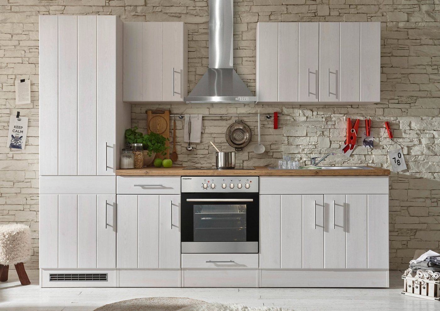 Die Küchenzeile »Ulm« mit E-Geräten und Kaminhaube aus dem Hause RESPEKTA beeindruckt mit einem ansprechenden Erscheinungsbild. Durch die farbliche Absetzung von Arbeitsplatte und Fronten entsteht ein schöner Kontrast, der für eine trendige Optik sorgt. Die Arbeitsplatte ist in einer Nachbildung von Wildeiche gestaltet. Sie hat eine ergonomische Arbeitshöhe, was sich im Alltag angenehm bemerkbar macht. Griffe aus Metall im Edelstahl-Look komplettieren das elegante Design im Landhausstil. Alle Auszüge sowie die Scharniere der Türen sind mit einer Soft-Close Funktion ausgestattet. Die Schränke dieser Einbauküche bieten dir viel Stauraum für Lebensmittel und Küchenutensilien. Mit der Küchenzeile »Ulm« mit E-Geräten und Kaminhaube aus dem Hause RESPEKTA stattest du deine Küche komfortabel und stilvoll aus.