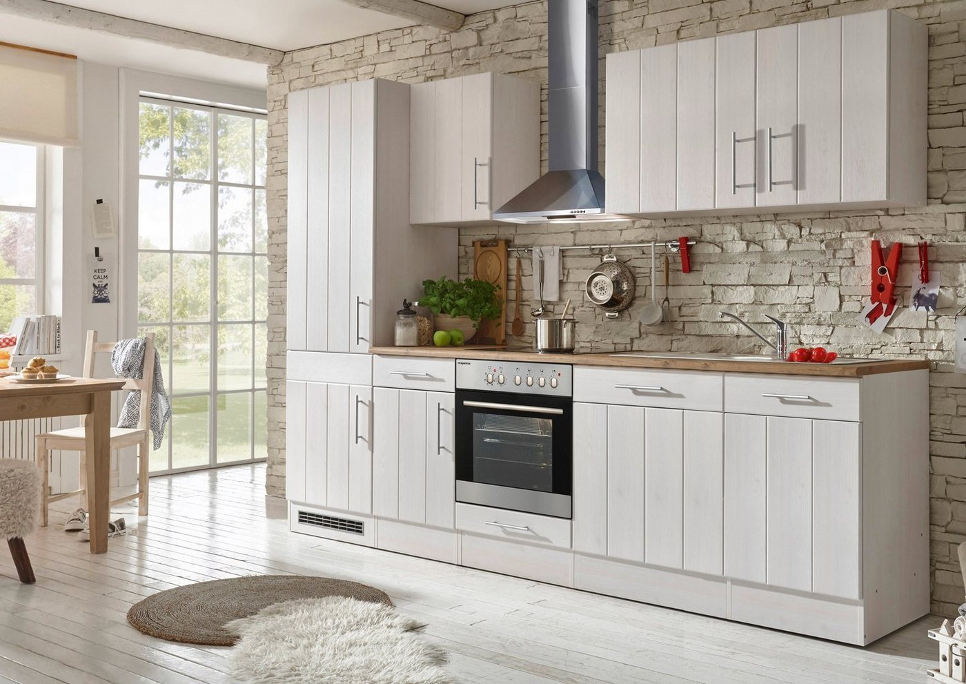 Die Küchenzeile »Ulm« mit E-Geräten und Kaminhaube aus dem Hause RESPEKTA beeindruckt mit einem ansprechenden Erscheinungsbild. Durch die farbliche Absetzung von Arbeitsplatte und Fronten entsteht ein schöner Kontrast, der für eine trendige Optik sorgt. Die Arbeitsplatte ist in einer Nachbildung von Wildeiche gestaltet. Sie hat eine ergonomische Arbeitshöhe, was sich im Alltag angenehm bemerkbar macht. Griffe aus Metall im Edelstahl-Look komplettieren das elegante Design im Landhausstil. Alle Auszüge sowie die Scharniere der Türen sind mit einer Soft-Close Funktion ausgestattet. Die Schränke dieser Einbauküche bieten dir viel Stauraum für Lebensmittel und Küchenutensilien. Mit der Küchenzeile »Ulm« mit E-Geräten und Kaminhaube aus dem Hause RESPEKTA stattest du deine Küche komfortabel und stilvoll aus.