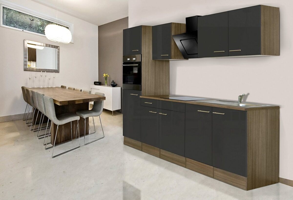Bei dieser Küche haben Sie die Qual der Wahl, denn die Küchenzeile »York« mit einer Gesamtbreite von 270cm gibt es in drei Farbausführungen. Korpus- und Arbeitsplatte haben eine natürliche eichefarbene Optik, bei dem seidenglänzenden Frontdekor wählen Sie zwischen edlem Weiß, schickem Schwarz oder trendigem Grau. Die Küchenzeile ist mit allem ausgestattet, was eine Küche braucht: Design-Schrägschirmhaube, Backofen, Glaskeramikkochfeld und Kühlschrank.