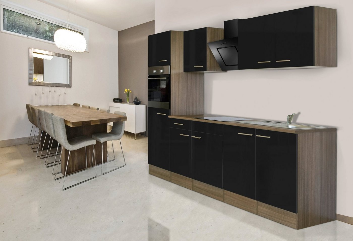 Bei dieser Küche haben Sie die Qual der Wahl, denn die Küchenzeile »York« mit einer Gesamtbreite von 270cm gibt es in drei Farbausführungen. Korpus- und Arbeitsplatte haben eine natürliche eichefarbene Optik, bei dem seidenglänzenden Frontdekor wählen Sie zwischen edlem Weiß, schickem Schwarz oder trendigem Grau. Die Küchenzeile ist mit allem ausgestattet, was eine Küche braucht: Design-Schrägschirmhaube, Backofen, Glaskeramikkochfeld und Kühlschrank.