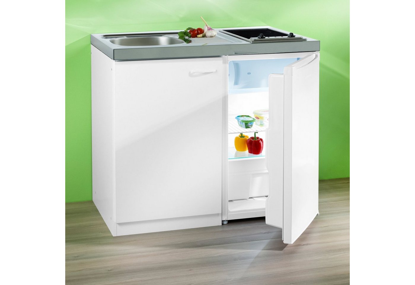 Ideal für deinen Singlehaushalt oder die Ferienwohnung ist die kompakte Miniküche geeignet. Sie fügt sich platzsparend auch in kleine Bereiche ein und stellt dennoch eine komfortable Basisausstattung bereit. Dabei bietet die Pantryküche ein schlichtes und zeitloses Design, das zu allen Einrichtungsstilen passt. Kantige Formen und eine neutrale Farbgebung bestimmen die Optik. Die Singleküche beinhaltet einen geräumigen Kühlschrank mit Gefrierfach sowie ein Glaskeramik-Kochfeld. Ein Edelstahl-Spülbecken und das großzügige Stauraumfach mit Bügelgriff aus Kunststoff komplettieren die Ausstattung. Korpus und Front des Mini-Küchenblocks bestehen aus beschichteten Holzwerkstoffen, die dir leicht zu pflegende Oberflächen zur Verfügung stellen. Benötigt nur wenig Platz bei maximalen Möglichkeiten: die kompakte Miniküche.