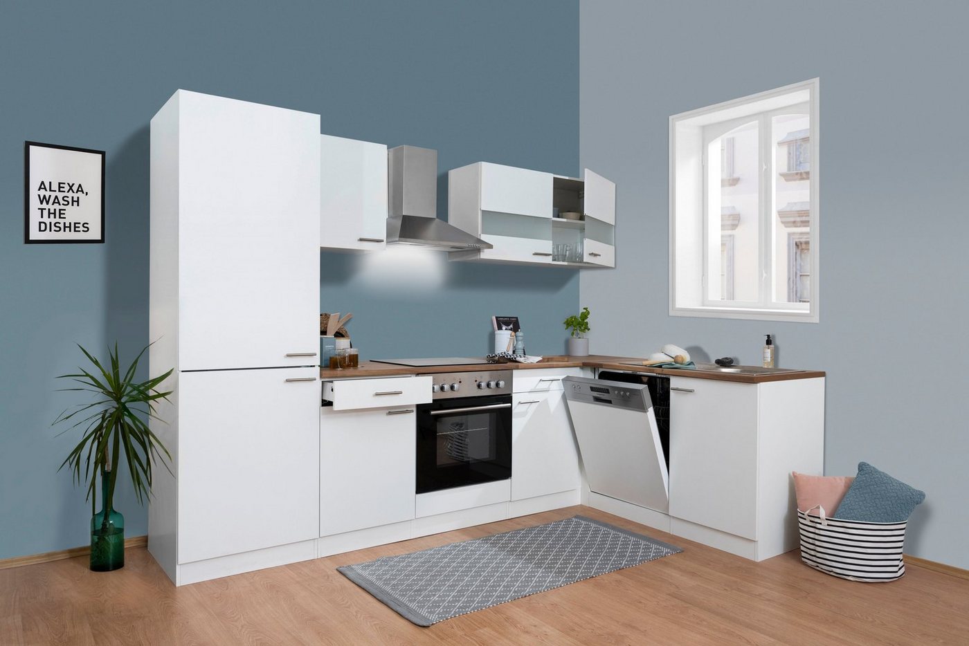 Die Winkelküche »Hamm« von RESPEKTA mit E-Geräten ist die passende Lösung für kleine und schmale Küchen. Sie setzt auf ein trendiges Design und begeistert durch Fronten mit Glaseinsätzen. Stangengriffe aus Metall runden die Optik ab. Da die Eckküche in verschiedenen Farbvarianten erhältlich ist, kannst du sie nach deinem Geschmack auswählen. Geliefert wird sie mit Elektrogeräten wie Dunstabzugshaube, Kühlschrank und einem Herd-Set. In den Ober- und Unterschränken offenbart die L-Küche Stauraum für deine Küchenutensilien. Durch die Soft-Close-Funktion schließen die Türen leise und materialschonend. Abgerundet wird die Einbauküche durch eine großzügige Arbeitsplatte, auf der du deine Gerichte zubereiten kannst. Überzeugt mit moderner Optik und viel Platz: die Winkelküche »Hamm« von RESPEKTA mit E-Geräten.