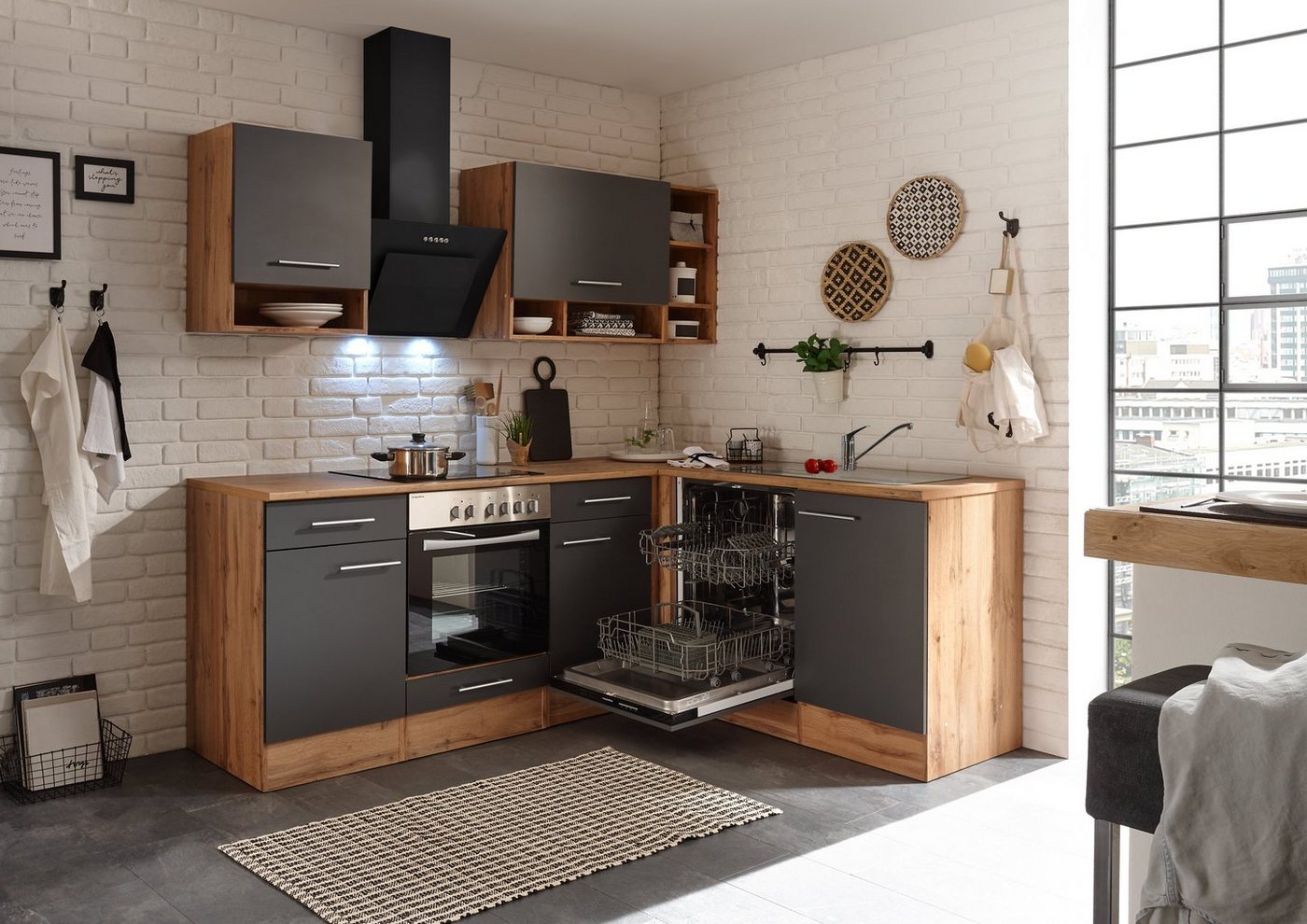 Viel Stauraum und Komfort bietet dir die moderne Winkelküche »Lübeck« der Marke RESPEKTA mit E-Geräten. Optisch besticht sie mit einem schönen Wildeiche-Korpus und schlichten einfarbigen Fronten. Hochwertige Stangengriffe aus Metall runden das Design harmonisch ab. Diese Küche bietet dir in Schränken und einem Regal viele Stauraummöglichkeiten für Vorräte, Kochgeschirr und Küchenutensilien. Ein Herd mit Glaskeramikkochfeld, eine Dunstabzugshaube, ein energieeffizienter Geschirrspüler und eine praktische Arbeitsplatte sind im Lieferumfang enthalten. In mehreren attraktiven Farben erhältlich: Winkelküche »Lübeck« der Marke RESPEKTA mit E-Geräten und viel Stauraum.