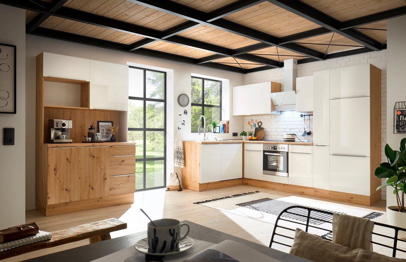 Komplettausstattung für deine Küche: Bei der Winkelküche »Safado« von RESPEKTA mit Apothekerschrank handelt es sich um ein Komplett-Set. Die Optik der Einbauküche ist durch den reizvollen Dekormix geprägt. Griff-Leisten in Alu-Optik runden den Look ab. Neben den Stauraummöbeln sowie den Geräteumbauschränken sind auch schon alle erforderlichen E-Geräte und eine Arbeitsplatte im Lieferumfang enthalten. In den Unter- und Oberschränken befinden sich zahlreiche Ablagefächer und Schubladen, in denen du Geschirr, Besteck, Töpfe und Pfannen aufbewahren kannst. Das E-Geräte-Set umfasst neben einem Backofen, einem Herd und einer Dunstabzugshaube auch eine Kühl-Gefrier-Kombination sowie einen Geschirrspüler. Die Winkelküche »Safado« von RESPEKTA mit Apothekerschrank besitzt höhenverstellbare Füße.
