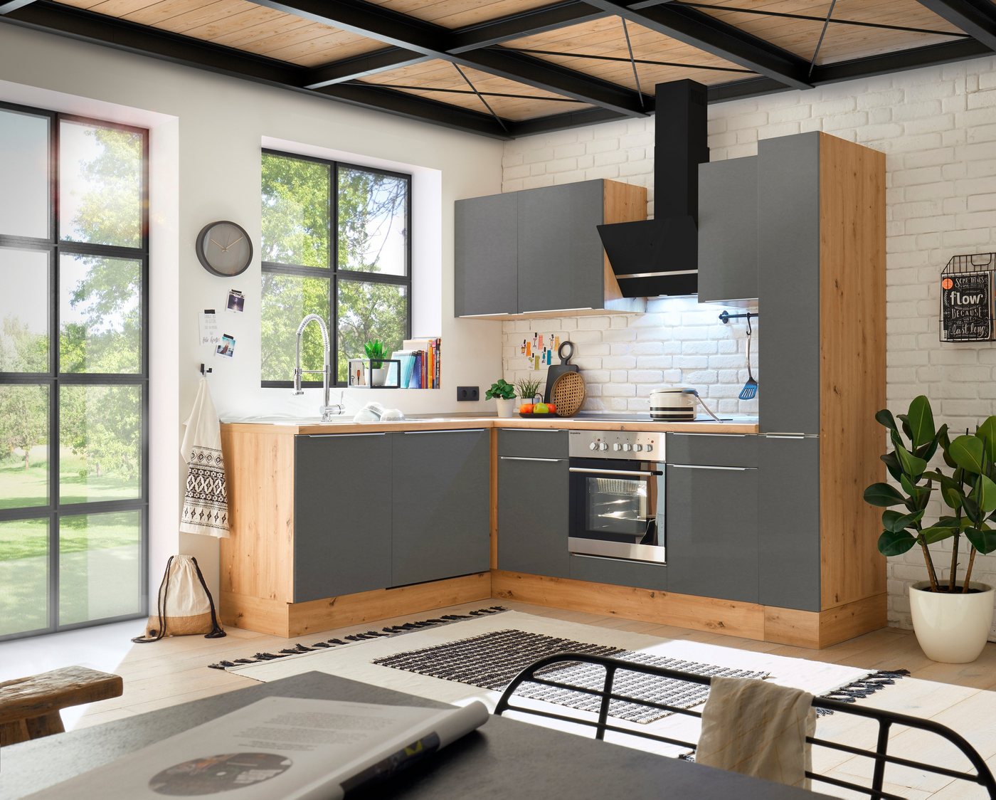 Nutzt den vorhandenen Platz in deiner Küche clever aus: Die Winkelküche »Safado« von RESPEKTA mit Elementen in Holzoptik. Sie setzt auf ein modernes Design und besitzt eine attraktive Griffleiste in Alu-Optik. Um dir Spielraum für persönliche Einrichtungswünsche zu geben, ist die Eckküche in verschiedenen Farbvarianten erhältlich. Geliefert wird sie mit E-Geräten wie einem Herd-Set, Geschirrspüler und einer Dunstabzugshaube. Die Ober- und Unterschränke offenbaren viel Stauraum für Geschirr, Lebensmittel und Kochtöpfe. Durch die Soft-Close-Funktion schließen sie geräuscharm. Als nützliches Extra verfügt die Einbauküche über höhenverstellbare Füße, die einen Ausgleich von Bodenunebenheiten ermöglichen. Setzt trendige Akzente in deiner Küche: die Winkelküche »Safado« von RESPEKTA mit Elementen in Holzoptik.