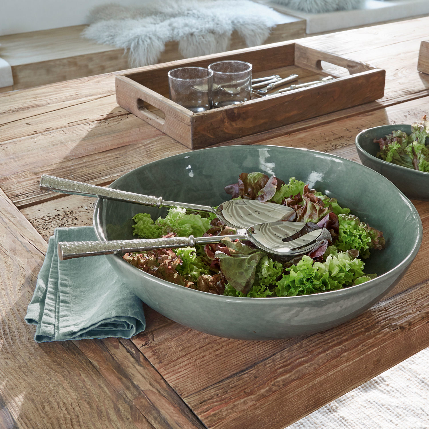 Ein wundervoll elegantes Accessoire, mit dem Ihre Tafel noch stilvoller wird. Das edle Salatbesteck aus rostfreiem Edelstahl bezaubert mit fein gehämmerten Details an den Griffen aus Messing, die der ansonsten klassischen Optik das besondere Etwas geben. Hiermit beweisen Sie guten Stil und können sich bei jeder Mahlzeit auf einen stilsicher gedeckten Tisch freuen. Das schicke Salatbesteck ist spülmaschinengeeignet, sodass Sie keine Mühe mit der Reinigung haben und es immer sauber glänzt. Das Auftun von Kartoffelsalat, grünen Salaten oder knackigem Gurkensalat wird hiermit zum Kinderspiel. Feine Details wie dieses sorgen für ein wunderbares Wohngefühl. Wir wünschen guten Appetit.