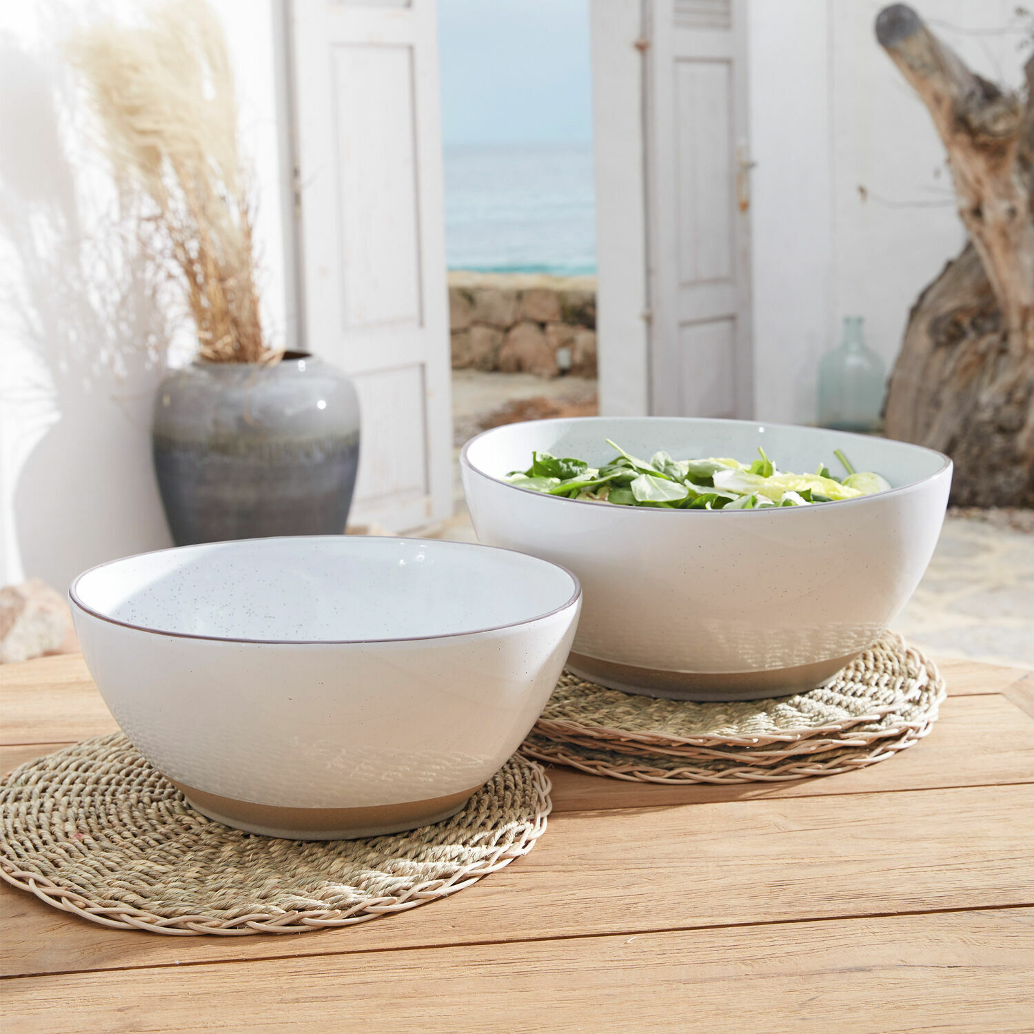 Dieses charmante Duo bringt einen Hauch Mittelmeer auf Ihre Tafel. Die schönen Schalen aus Steingut haben eine reizvolle Optik, welche an Handwerkskunst aus dem sonnigen Süden erinnert. Leichte Unebenheiten sind hier ganz bewusst gestaltet, um dem Set noch mehr individuelles Flair zu verleihen. Der edle, dunkle Rand ist ein hübsches Detail, so wie auch der unglasierte Boden. Sie erhalten zwei Größen im Set. Die beiden stilvollen Schalen lassen sich sehr vielseitig nutzen, etwa um Pasta oder Salat zu genießen. Oder arrangieren Sie Oliven und Nüsschen darin, servieren Sie eine Suppe oder naschen Sie frisch geschnittenes Obst daraus. Wer möchte, könnte auch dekorative Arrangements erschaffen, vielleicht mit Trockenblüten und Muscheln befüllt. Und auch zum Aufbewahren kleiner Dinge wie Haarnadeln bieten die attraktiven Schalen sich an. Freuen Sie sich auf zwei echte Multitalente.