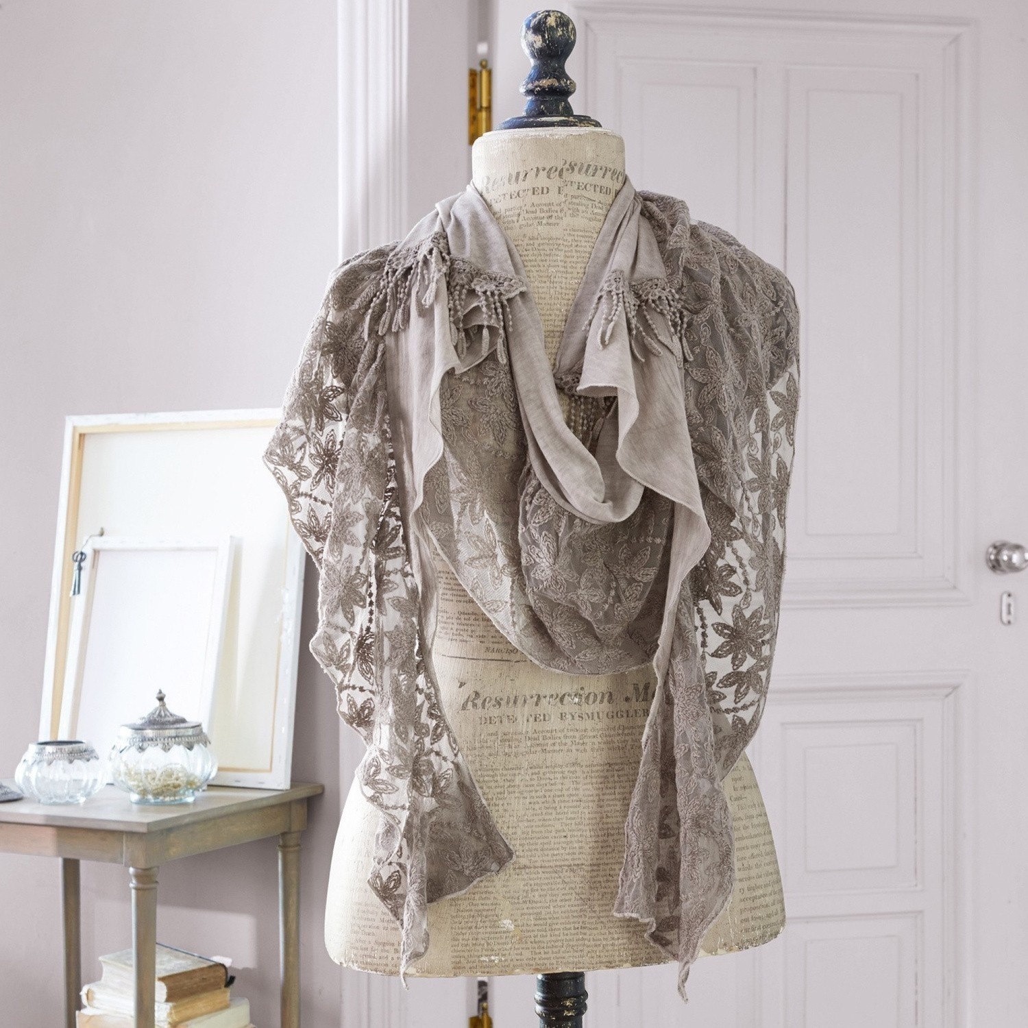 Dieser Schal aus zarter Viskose und luftig leicht gewebter Baumwolle ist geradezu verschwenderisch geschmückt. Die filigranen Stickereien kommen auf dem transparenten Gewebe wunderschön zur Geltung. Es handelt sich um Blüten- und Rankmuster. Die Volant-Optik und aufwendig geschmückte Fransen machen den zauberhaften Look komplett.