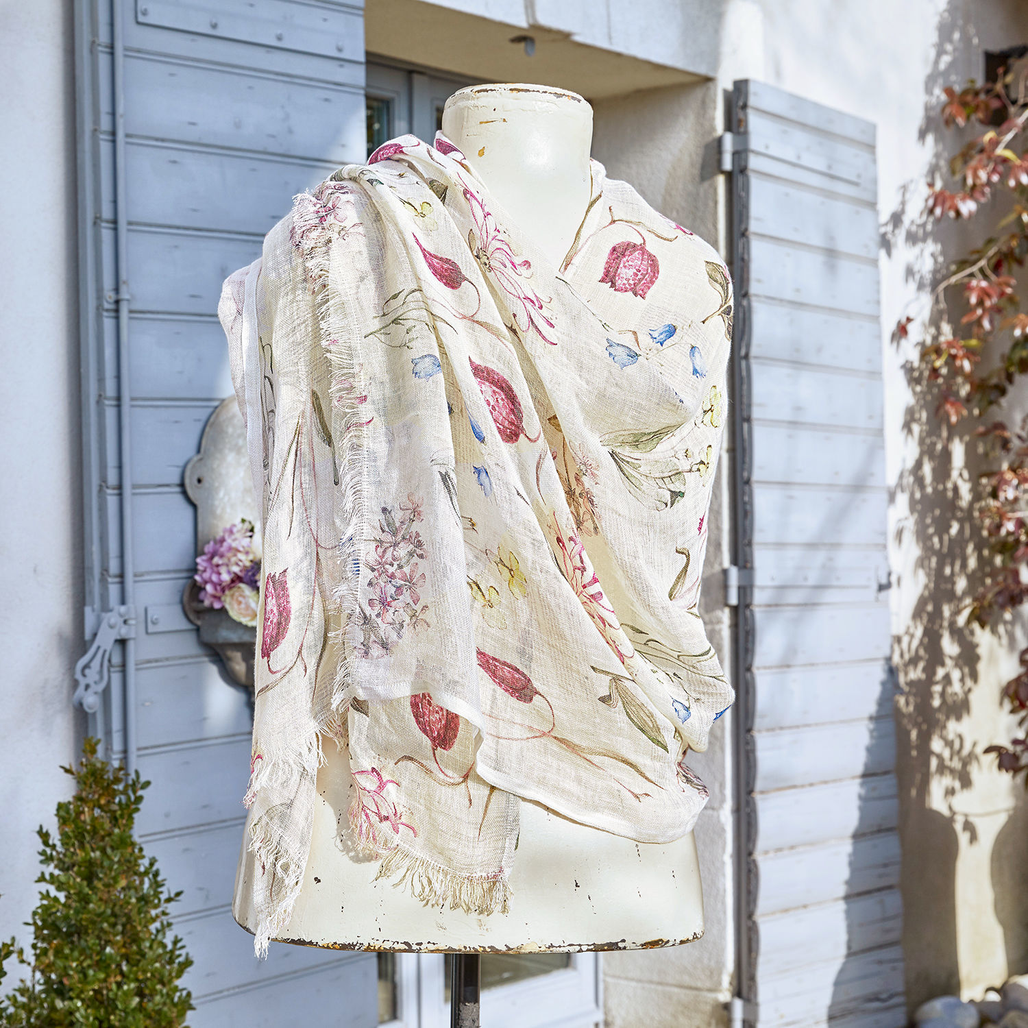 Was wäre der Mode-Sommer ohne den Charme zauberhafter Blütenprints. Dieser Schal nimmt den Romantik-Trend gekonnt auf und setzt die Vielfalt der Naturschönheiten besonders eindrucksvoll in Szene. Filigran gezeichnet wirken die Blütenmotive nahezu naturgetreu, perfekt ergänzt durch die edle Farbharmonie avanciert das Design zu einem unwiderstehlichen Blickfang. Dazu passt fantastisch die natürliche Qualität aus reinem Leinen – weich fließend, leicht und luftig im Tragegefühl ist sie ideal für die warme Jahreszeit. Feine Fransen an den Schmalkanten runden das Accessoire ab. Verleihen Sie Ihrem romantischen Look das i-Tüpfelchen – zarte Spitzenblusen oder Trägerkleider veredelt der Schal gleichermaßen schön. Auch zum klassischen Blazer oder schlichten Shirt können Sie mit dem Schal wunderbare Effekte erzielen. Und wird das Dinner auf der Terrasse Ihres Lieblingsrestaurants etwas länger, ist er auch als sanft wärmende Stola perfekt einsetzbar.