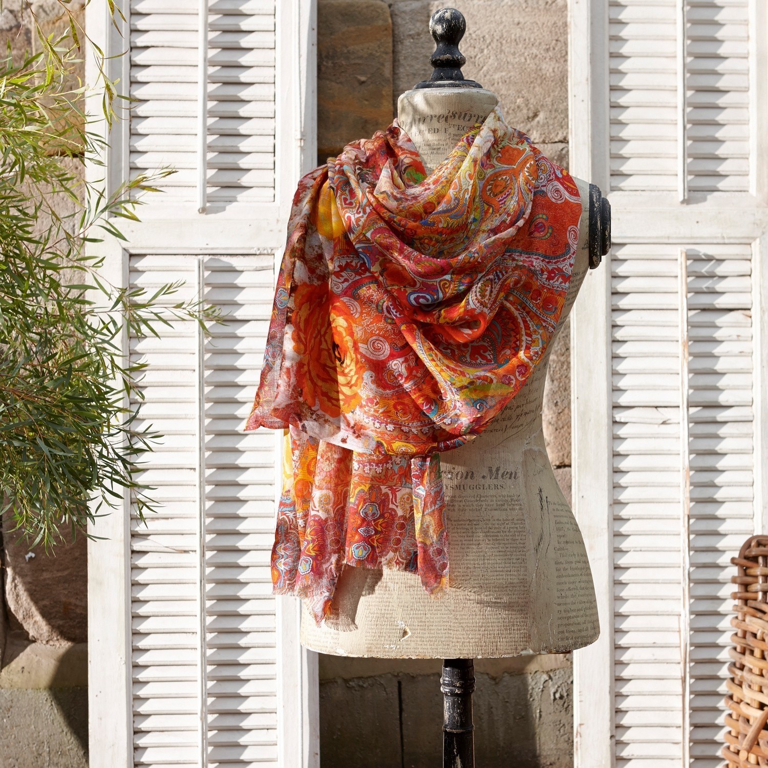 Dieser prächtige Schal vermittelt Lebensfreude und Sommer-Feeling pur. Er ist aus feinster Wolle gewebt, fühlt sich herrlich weich und kuschelig an. Dass er trotz seiner Größe nur 90 Gramm wiegt, zeugt von einer hohen Material- und Verarbeitungsqualität. Florale Muster verleihen dem charmanten Dessin ein bezauberndes, natürliches Flair und machen den Schal zu einem Lieblingsaccessoire.