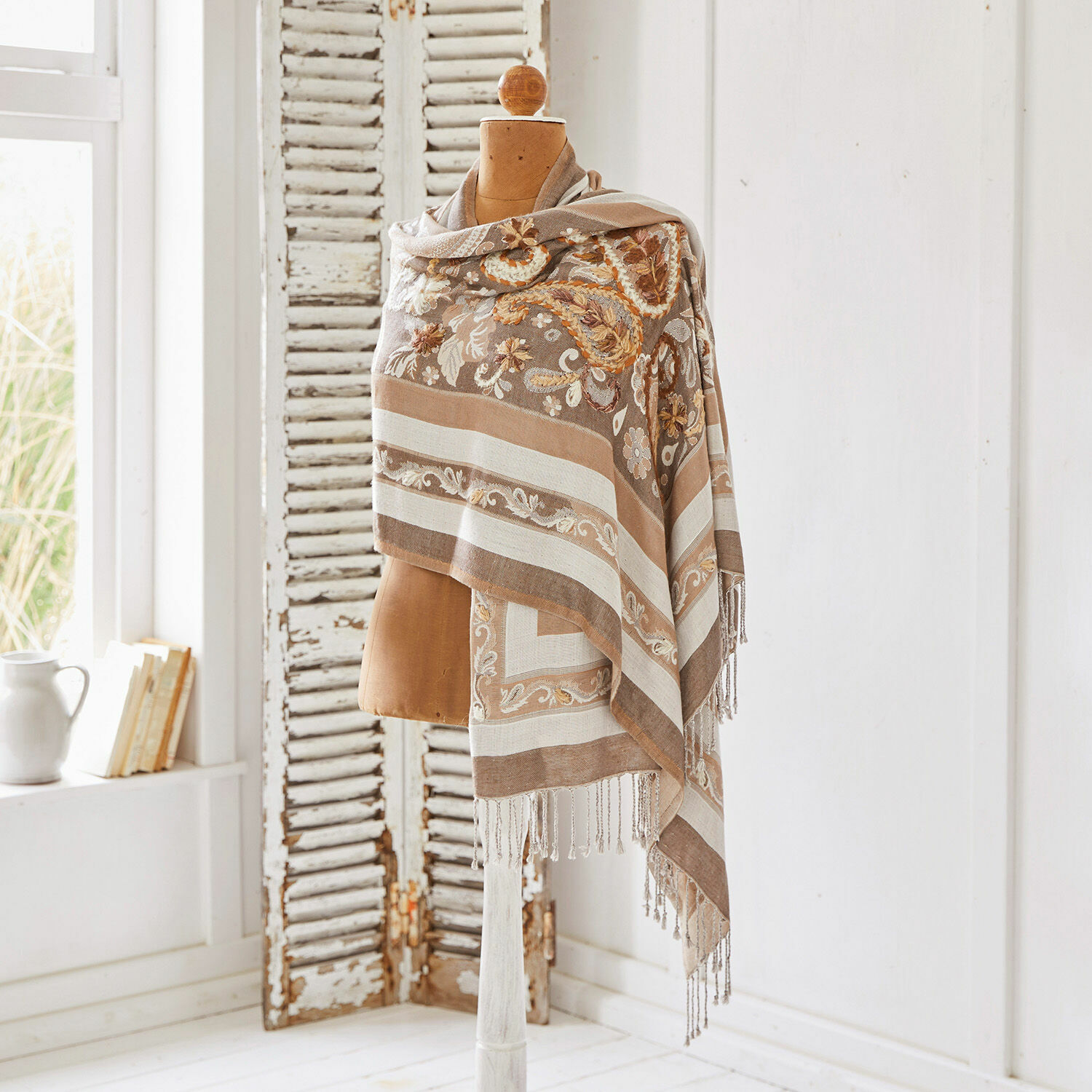 Heute ein schmückendes Accessoire zum Hosenanzug, morgen ein eleganter Blickfang zum schulterfreien Abendkleid – diesen exquisiten Schal werden Sie lieben, denn er ist ein echter Alleskönner und begleitet Sie das ganze Jahr über. Das Farbspektrum aus harmonisch abgestimmten Naturnuancen wirkt edel und zurückhaltend zugleich und macht ihn besonders vielseitig kombinierbar. Das Material ist ideal für jede Jahreszeit: Das feine Viskosegewebe begeistert nicht nur durch seine Leichtigkeit, sondern auch durch geschmeidigen Fall und ein angenehmes Tragegefühl. Zugleich bringt die glänzende Seiden-Optik das zeitlos schöne Paisleymuster besonders brillant zur Geltung. Dekorative Fransen an den schmalen Kanten runden den Webschal stilvoll ab.