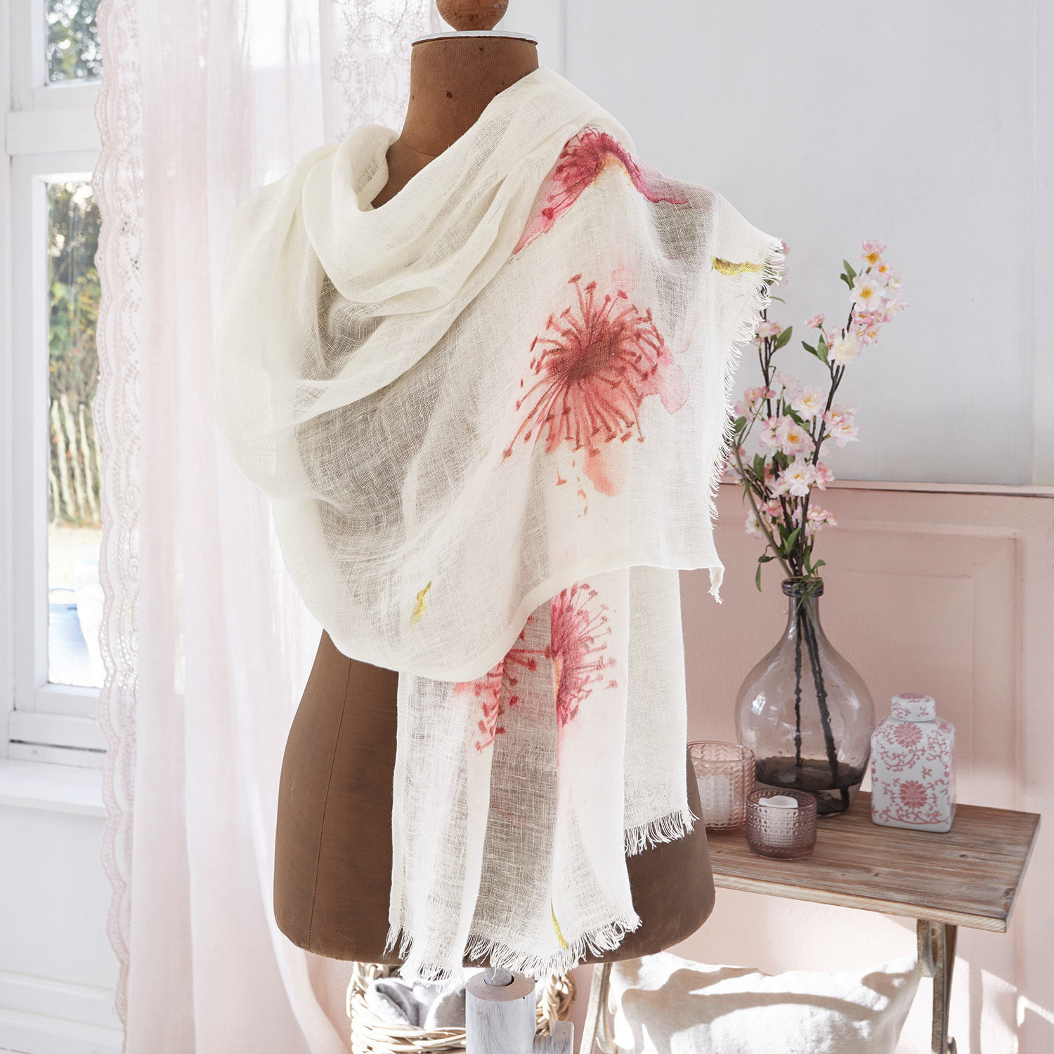 Im Look zart und romantisch, im Komfort natürlich und leicht. Freuen Sie sich auf das unvergleichliche Trageerlebnis dieses edlen Accessoires. Leinen ist eines der Lieblingsmaterialien für die wärmere Jahreszeit und wird hier zu einem wunderschönen Schal verwebt. Kein anderes Gewebe gibt sich so luftig auf der Haut und gleichzeitig charaktervoll in der Struktur. Denn die kleinen, unregelmäßigen Fadenverdickungen sind typisch für das Naturmaterial und sorgen für die lässig legere Note. In Kombination mit dem floralen Aquarellprint zeigt sich der Schal von seiner schönsten Seite und versprüht einen zauberhaften Charme. Feine Fransen an den schmalen Saumkanten runden das Textil ab. Eine wunderbare Styling-Ergänzung, mit dem Sie auf vielfältige Art und Weise den Frühling begrüßen können. Er verleiht dem femininen Romantik-Look oder dem eleganten Business-Outfit einen wirkungsvollen Akzent. Lässig um die Schultern gelegt, ist er auch ein leichter Wärmespender für die entspannten Abendstunden auf der Terrasse.