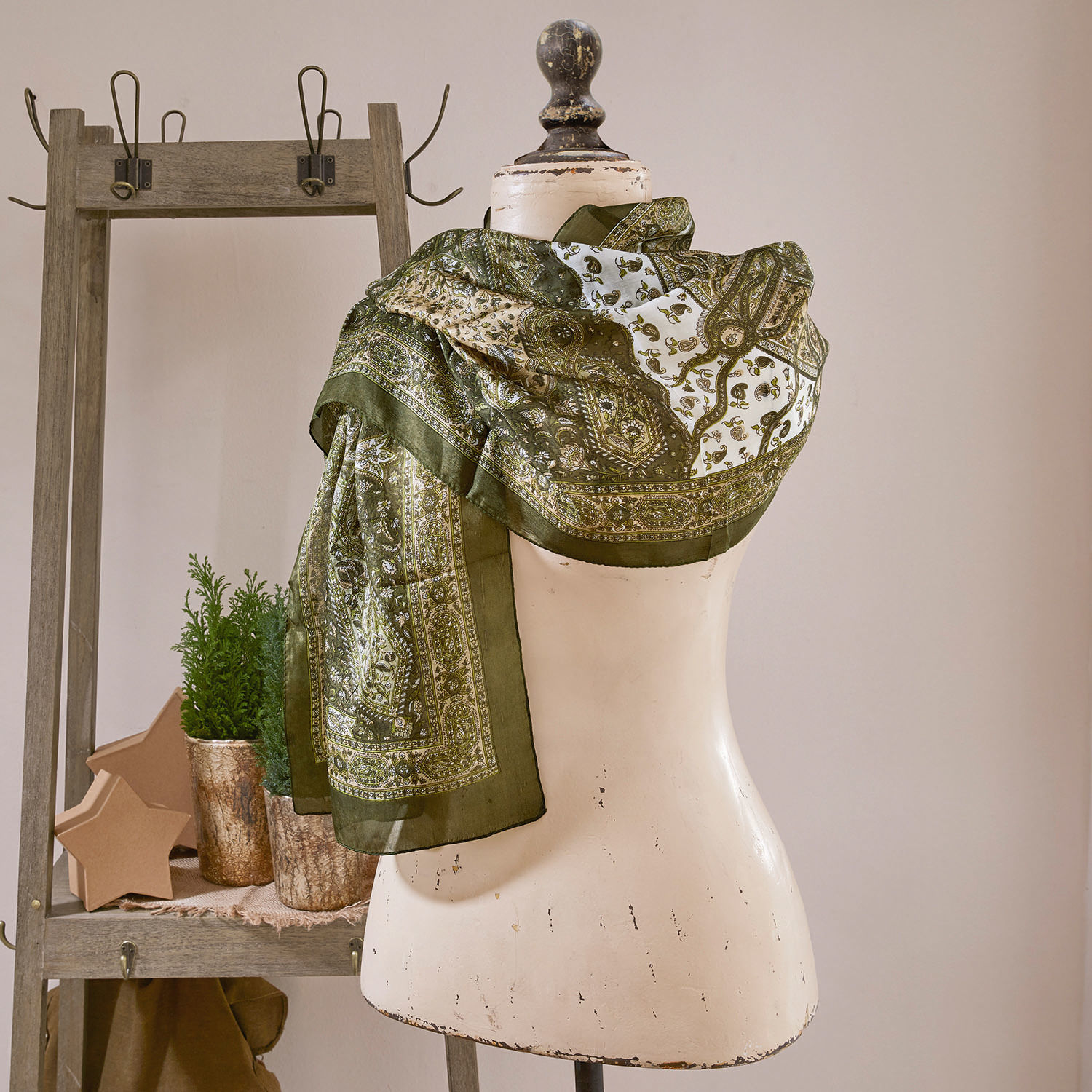 Leicht, geschmeidig und fein im Glanz – perfekte Attribute, die diesen kostbaren Schal aus reiner Seide zu einem unverzichtbaren Mode-Accessoire avancieren. Dekorativ um den Hals gelegt, schmiegt er sich wunderbar an und vermittelt ein Gefühl von edler Noblesse und Leichtigkeit. Der feine Webjacquard in abgestimmten Grüntönen bringt das orientalisch anmutende Paisley-Dessin besonders schön zur Geltung und macht diesen Schal zu einem modernen Edelklassiker. Souverän wird er jede Mode-Laune überdauern und mit vielen Teilen Ihrer Garderobe harmonieren. Leger und lässig wirkt er zu urbanen Casual-Styles, elegant zum feinen Mantel oder Blazer. Dank des großzügigen Formats lässt er sich auch dekorativ wickeln oder binden. Kombinieren und stylen Sie den Seidenschal, wie es Ihnen gefällt.
