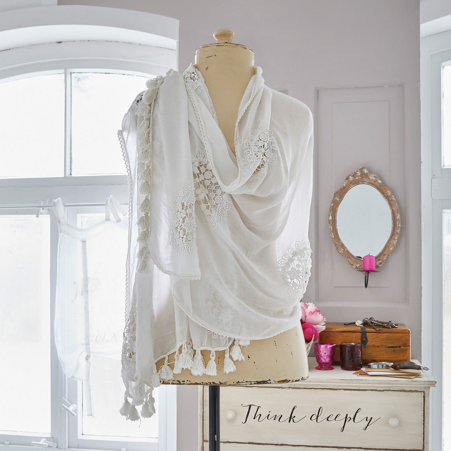 Mit diesem filigranen Accessoire können Sie Ihrem Outfit im Handumdrehen eine besonders feminine und sommerliche Note verleihen. Zarte Blumen-Stickereien zieren den feinen Stoff, der luftig-leicht den Körper umspielt. Verspielte Quasten an den Rändern geben dem Design noch das berühmte i-Tüpfelchen. Doch nicht nur optisch ist das textile Traumstück einfach hinreißend, auch der Komfort überzeugt. Das weiche Gemisch aus Baumwolle und Viskose ist besonders hautsympathisch und auch bei höheren Temperaturen sehr angenehm zu tragen, denn das Material nimmt Feuchtigkeit auf und ist atmungsaktiv. Am Abend kann das schöne Teil wunderbar als feiner Schulterschmuck getragen werden, etwa auf der Party im Garten zum schulterfreien Sommerkleid. Auch als hübscher und leichter Halswärmer macht sich das sommerliche Must-Have ganz hervorragend. Am Strand ist das Tuch schnell übergeworfen, wenn Sie sich schnell ein Getränk von der Strandbar holen möchten. Und wenn es nicht gebraucht wird, passt es zusammengefaltet wunderbar in die Tasche. Wetten, dass dieses Stück schnell zu Ihrem Liebsten Begleiter wird?