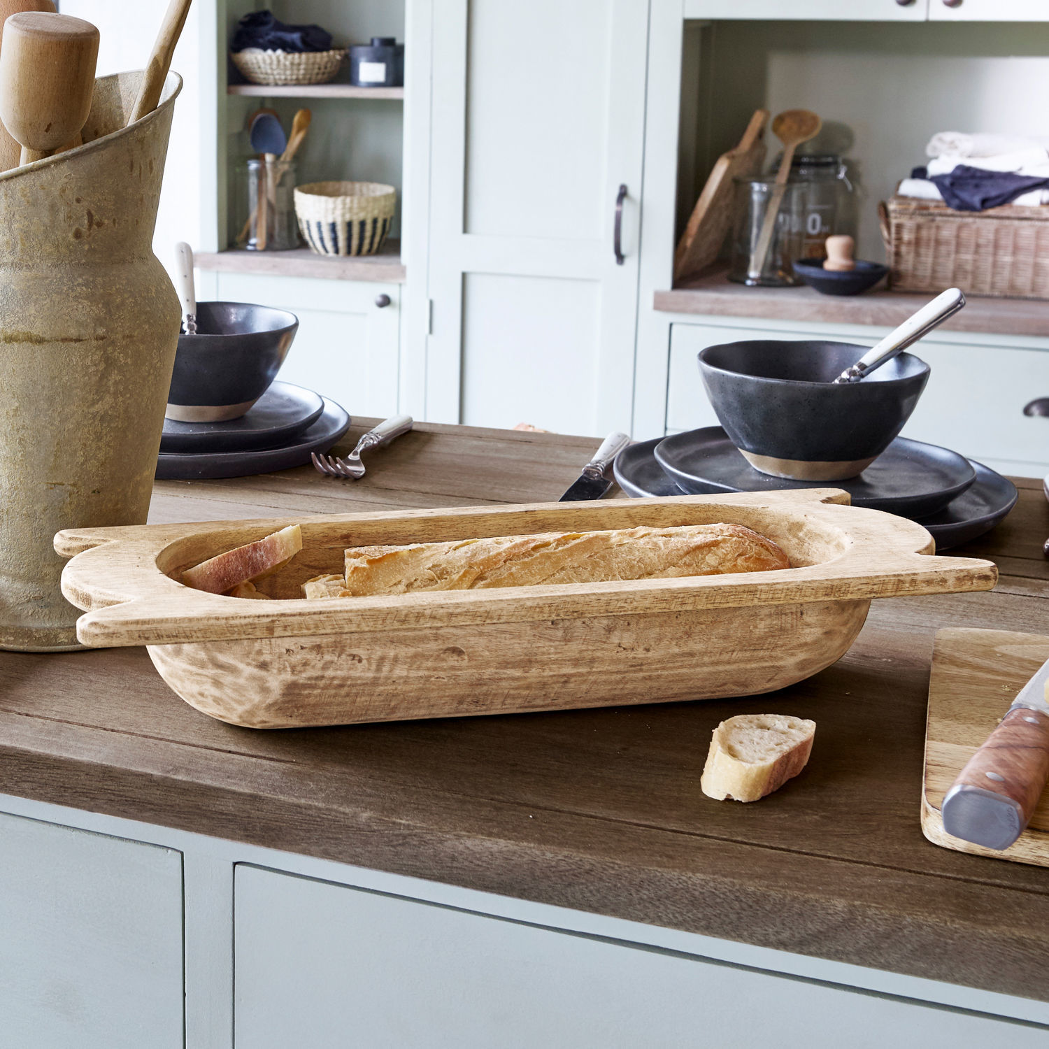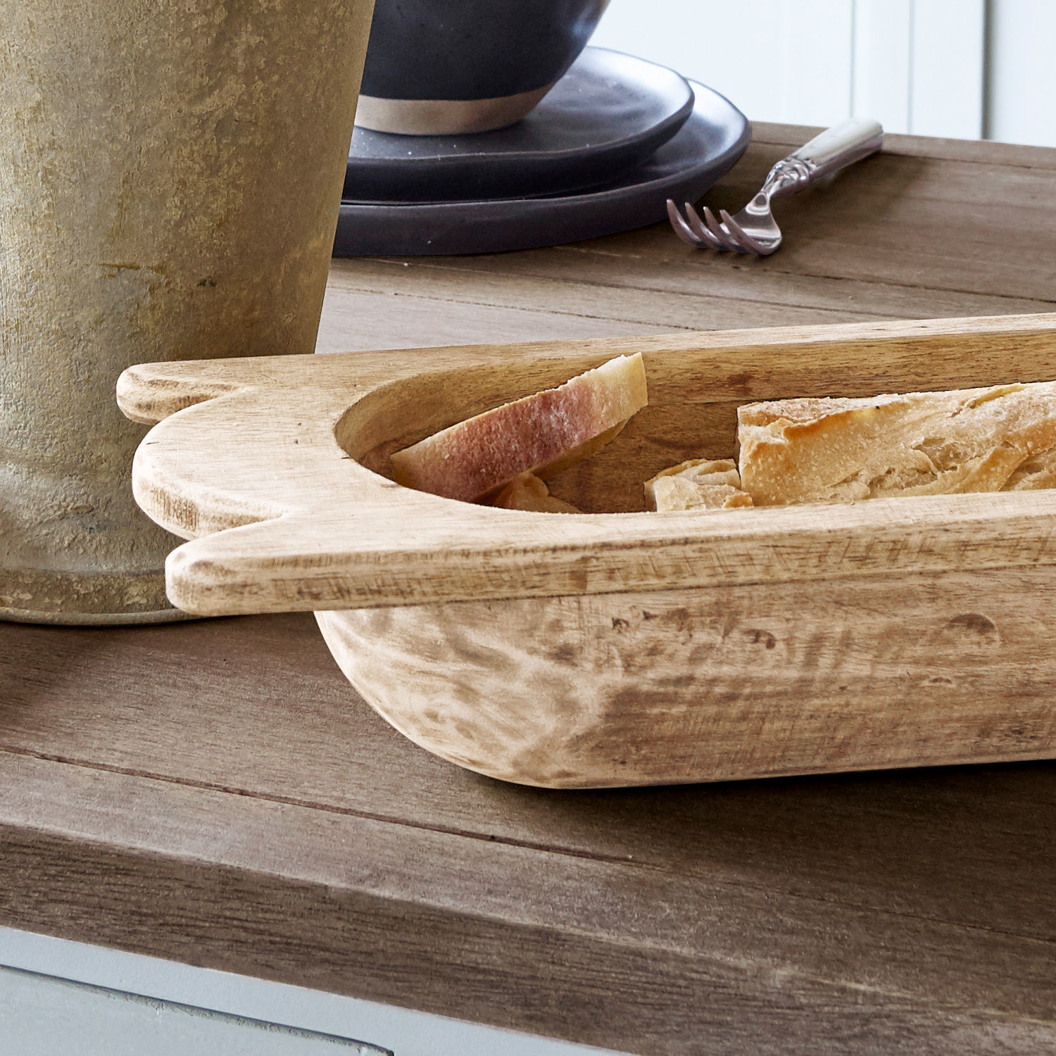 Natur pur – diese wertvolle Schale besteht aus naturbelassenem Mangoholz mit feiner, dezenter Maserung. Sie macht jedes Stück zu einem Unikat. Das lebensmittelechte Design ist Brotschalen aus früheren Zeiten nachempfunden – ein schönes Detail mit Landhaus-Flair. So eignet die ansprechende und recht große Schale sich auch ideal, um darin Brot zu servieren oder Gemüse und Obst anzurichten. Als Schmuckstück auf dem Tisch oder nützlicher Helfer in der Küche, diese Naturschönheit lässt sich vielseitig nutzen. Wer möchte, könnte darin auch Dekoratives kreativ präsentieren oder kleine Gegenstände in ihr verwahren. In jedem Fall zieht so ein zeitloses Design mit schöner Vintage-Note bei Ihnen ein, welches Funktion und Dekoration perfekt vereint.