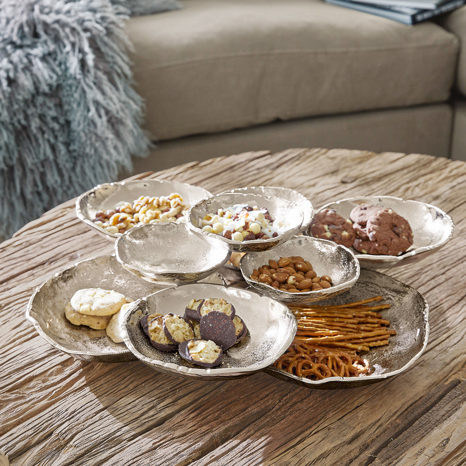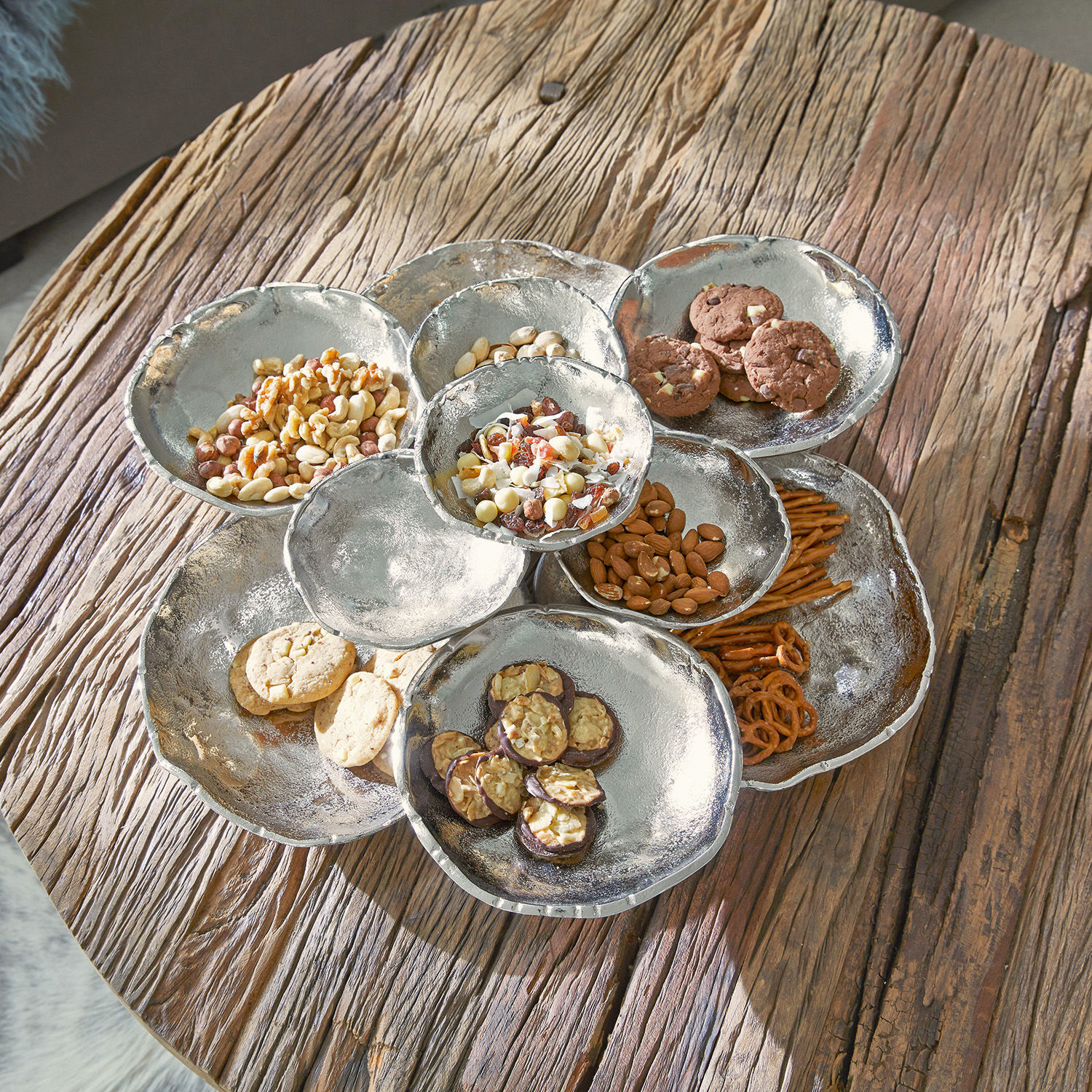 Luxus mit besonderer Note – erleben Sie ein hochwertiges Design voller Charme und Raffinesse. Die edle und recht große Schale aus Aluminiumguss hat eine besonders raffinierte Optik – als seien mehrere kleine Schalen zu einer großen zusammengefasst worden. So entstehen verschiedene Ebenen und eine ungewöhnliche Optik. Darin lassen sich wunderbar schöne Dinge arrangieren – Schmuck wie Ringe und Ohrringe, Edelsteine und Kristalle oder andere hübsche Gegenstände, hier können Sie kreativ werden. Schaffen Sie ein Highlight auf dem Tisch oder einer Anrichte und freuen Sie sich jeden Tag über dieses innovative und geschmackvolle Accessoire, das vielen Wohnstilen gut steht.