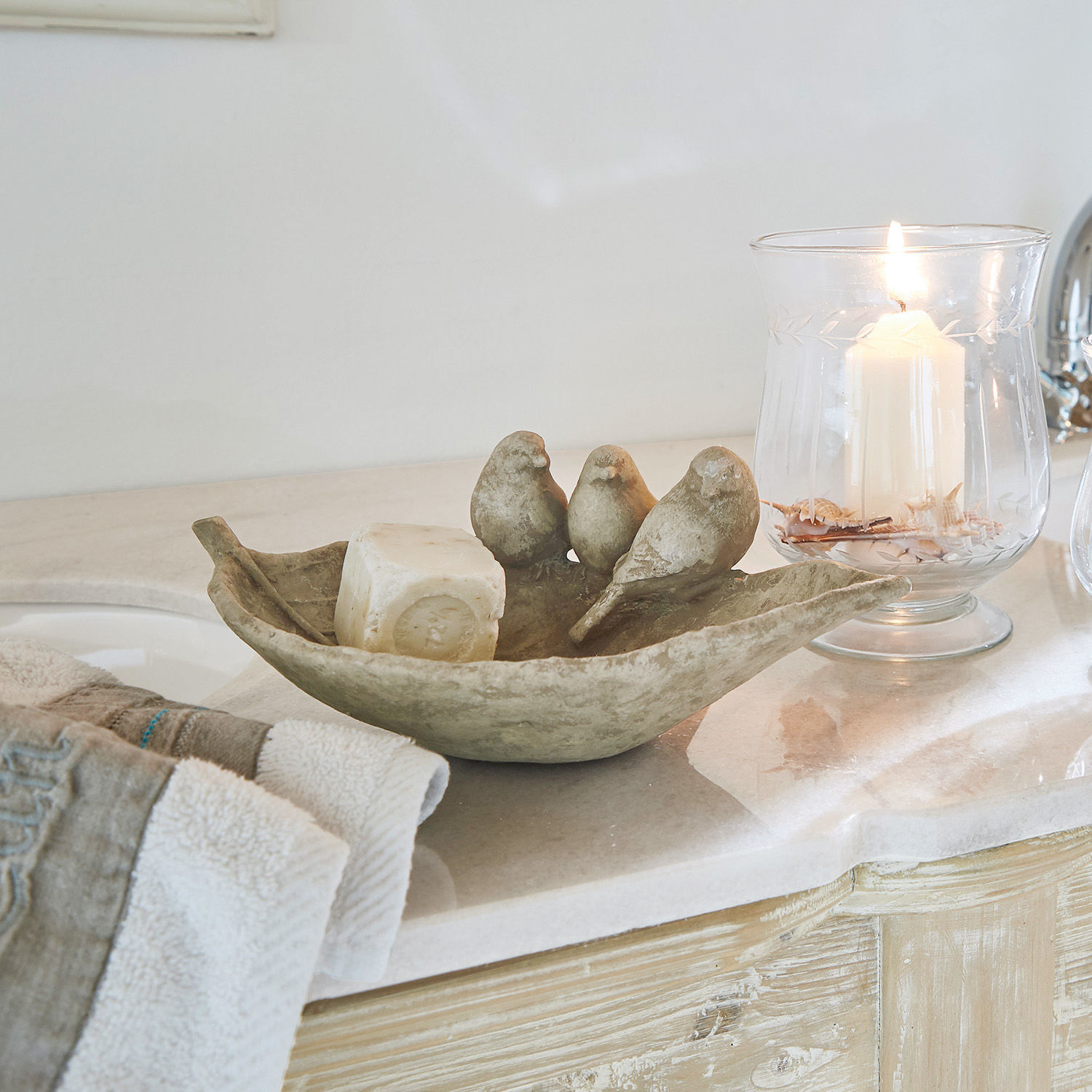 Diese dekorative Kunststeinschale ist wirklich einzigartig und das meinen wir durchaus wörtlich, denn das handgearbeitete Finish mit seinen feinen Unregelmäßigkeiten macht jedes Stück zum Unikat. Das kunstreiche Accessoire ist wie ein Blatt geformt und geizt nicht mit raffinierten Details. Dasselbe gilt für die charmanten Vögelchen, die auf dem Rand sitzen. Man erkennt an den zahlreichen Finessen, dass viel Sorgfalt und Liebe in diesem Design steckt. Ganz gleich, ob sie das Schmuckstück als Schlüsselschale im Flur oder als Seifenschale im Badezimmer nutzen – sie sorgt überall für eine natürliche und einladende Stimmung.