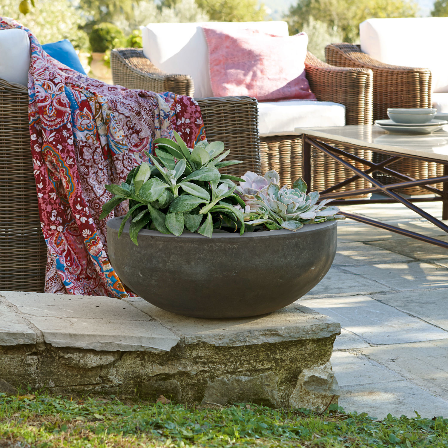 Die sanft gerundete Schale überzeugt mit einem kombinationsstarken Äußeren und vielfältigen Einsatzmöglichkeiten. Sie wurde handbearbeitet aus einem widerstandsfähigen Steingemisch, das zudem mit Wetterfestigkeit überzeugt. Eine aufwändig aufgebrachte Patina verleiht ihr einen individuellen Look und lässt die Schale gealtert wirken. So können Sie die Schale problemlos zum Bepflanzen benutzen. Aber auch für Deko-Elemente ist Sie ein wahrer Hingucker. Kurzum: Das Must-Have für den Garten – die rustikale Anmutung des Gefäßes passt zu garantiert jedem Stil.