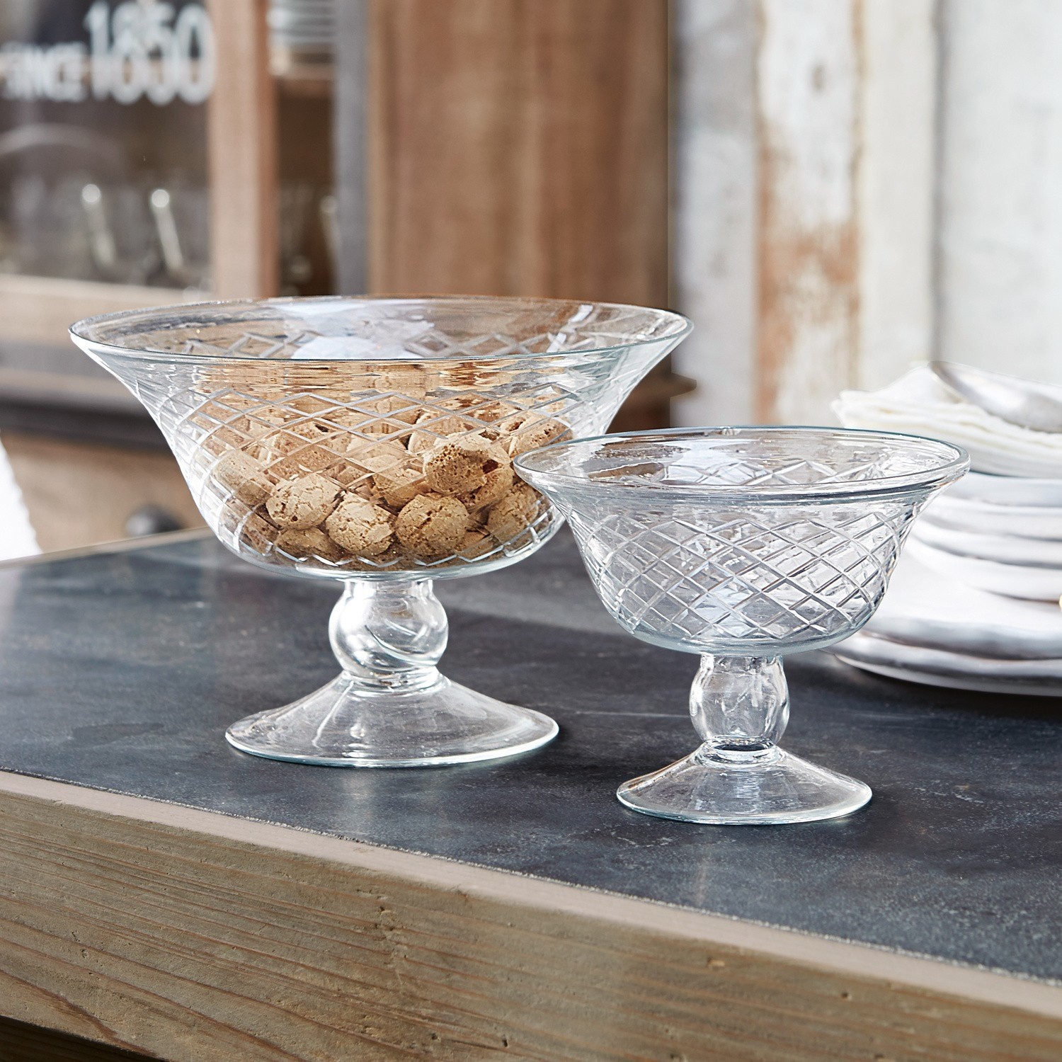 Ob als hübsche Obstschale oder stilvoller Platz für Süßes und Gebäck: Die zwei Glaspokale in unterschiedlichen Größen bieten sich direkt für verschiedenen Dinge an. Und sogar komplett ohne Inhalt sind sie ein echter Hingucker. Der Antik-Charme des klassischen Rautenschliffs macht das 2er Set zu einem zeitlos-eleganten Begleiter durch die Generationen. Ob in einer Küche im Landhaus-Stil, im klassischen Salon oder in einem eher modernen Ambiente – die Glasschalen mit Standfuß lassen sich zu jedem Geschmack harmonisch ergänzen. Ein echtes Highlight sind die beiden Schmuckstücke derweil vermutlich für alle Sammler und Fans des hochwertigen Vintage-Looks. Die Glaspokale eignen sich jederzeit also auch wunderbar als Geschenk – ob alleine oder zu zweit.