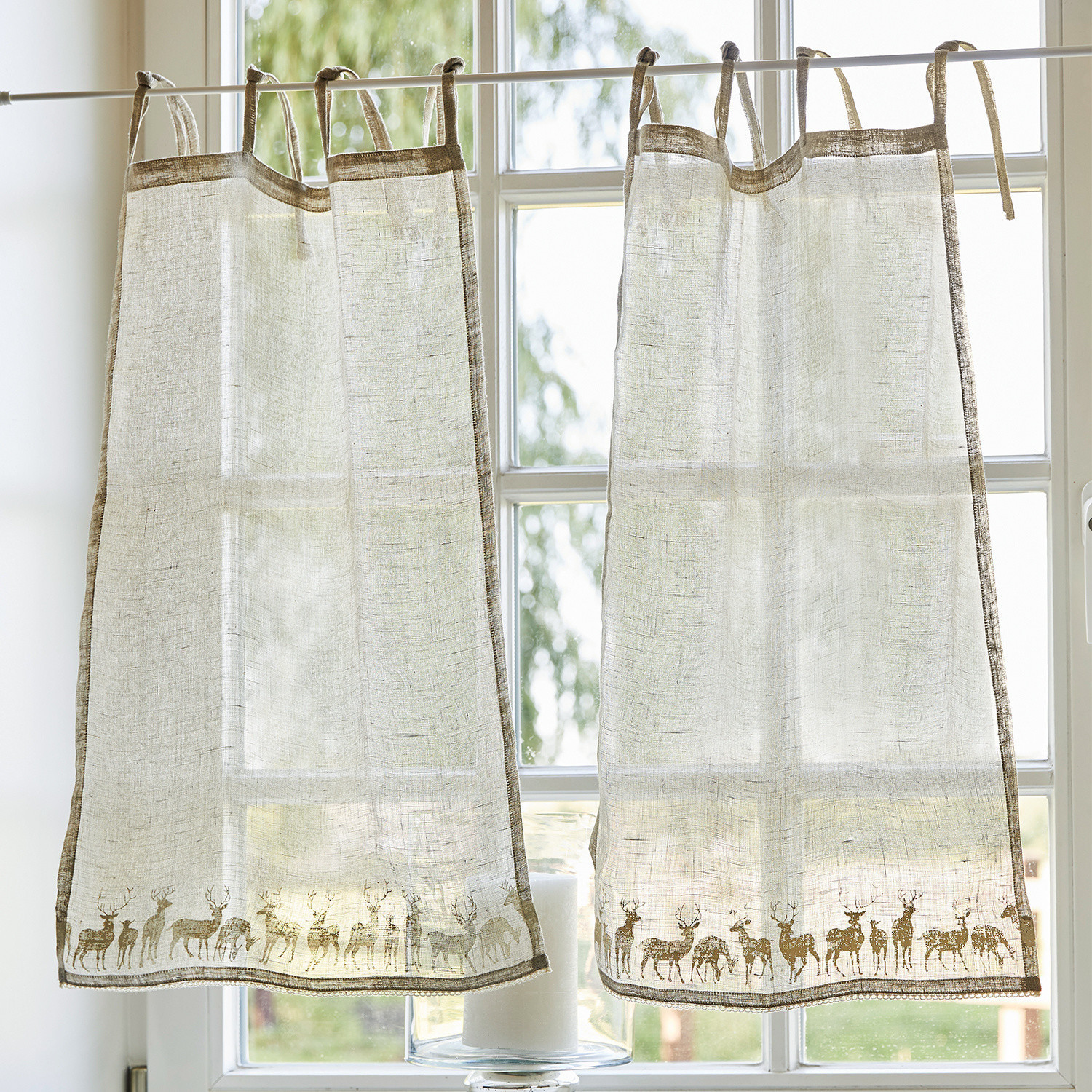 Ein wundervolles Accessoire mit Country-Charme. Das edle Duo aus reinem Leinen ist von Hand bedruckt. Die feinen Hirschfiguren erinnern an stille Wälder und Natur pur. Holen Sie sich diesen dezenten Schmuck nach Hause und veredeln Sie damit kleinere Fenster. Eine kleine Spitzenborte am unteren Rand und Bindebänder komplettieren das stimmungsvolle Design, das wunderbar zum Landhaus-Stil passt. Der Hirschprint macht sich das ganze Jahr hindurch gut. Zur Weihnachtszeit besonders dekorativ.