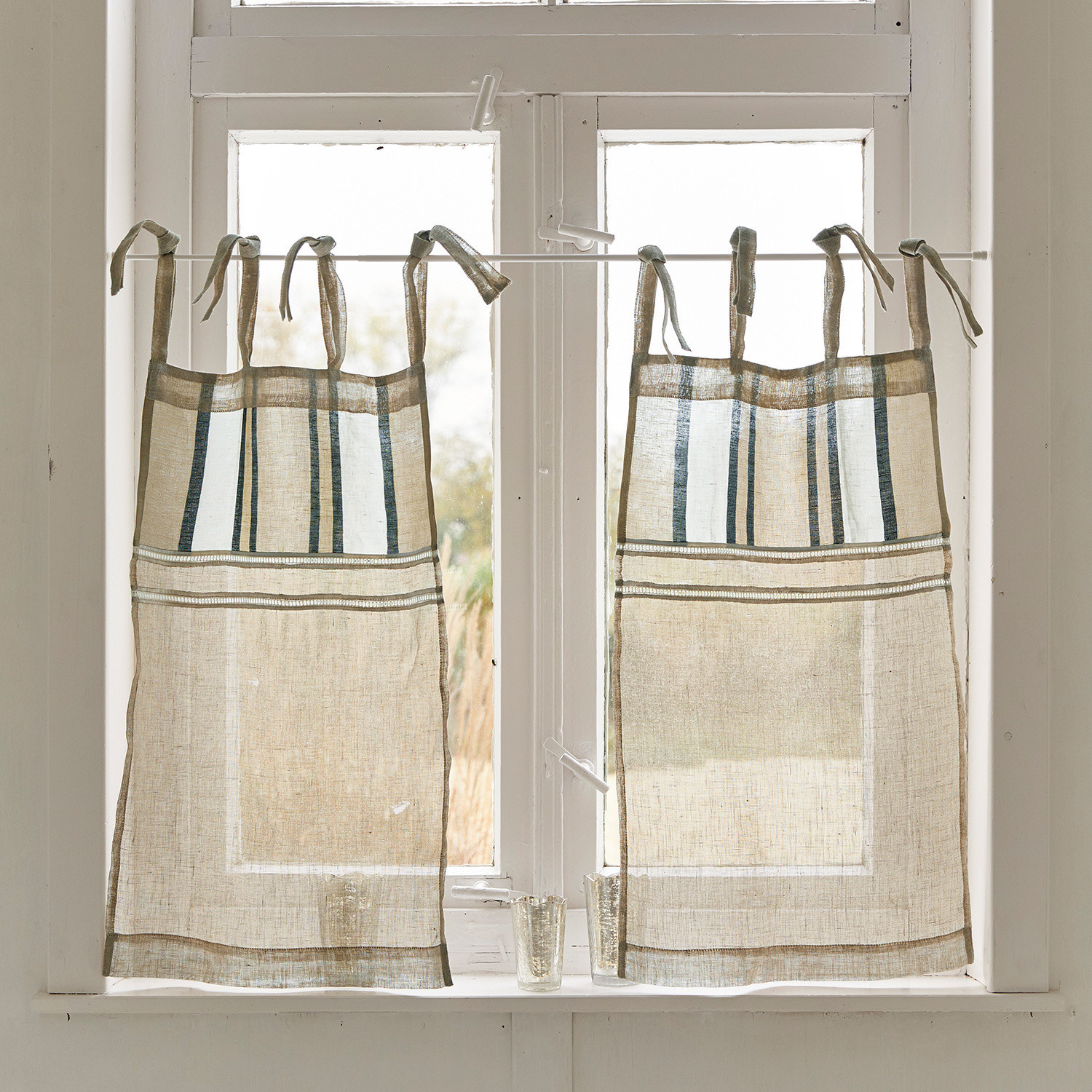 Dieses hübsche Set aus einem hochwertigen Gemisch aus Baumwolle und Leinen schmeichelt dem Raum mit seinem ganz einzigartigen Charme. Hübsche Details treffen auf natürliche Materialien und raffiniertes Design. Ganz besonders ist der obere Bereich hervorzuheben. Hier ziert ein schöner Druck den Stoff. Dieser macht das Material blickdicht. Zarte Lochstickereien verleihen eine dezent romantische Note. Der untere Teil ist leicht transparent. So kommt Tageslicht ins Zimmer, dennoch schützt der Stoff vor Blicken von außen. An der Gardinenstange werden die Vorhänge mit Bindebändern befestigt. Angenehm ist auch die zurückhaltende. Diese setzt im Raum einen Akzent, wirkt dabei jedoch nicht grell. Farbgebung Zu Interior im Landhaus-Stil, im skandinavischen Design und auch zu Inneneinrichtung mit viel Holz oder Vintage-Details sieht das hübsche Gardinen-Set ganz besonders zauberhaft aus.