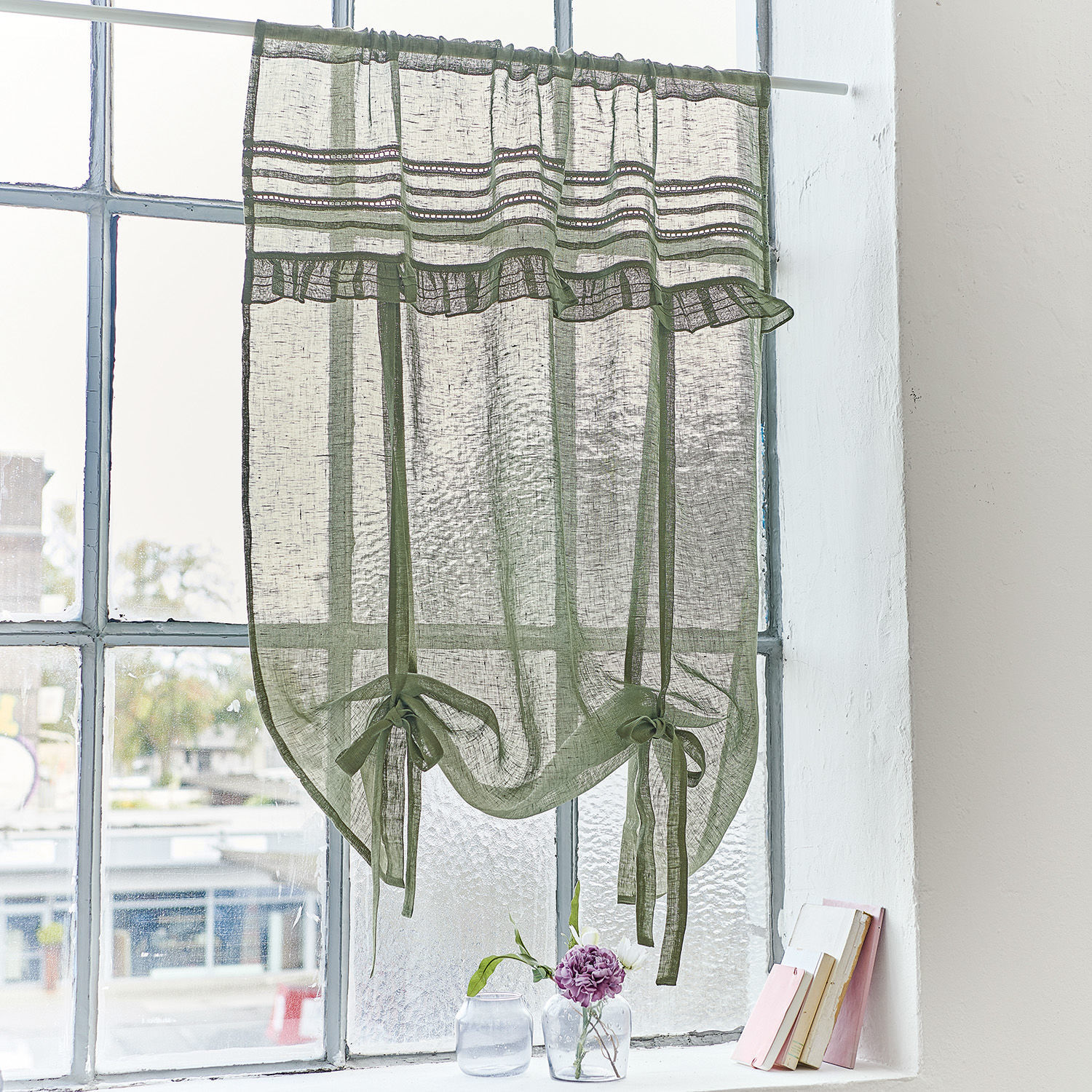 Dieser wunderbare Faltrollo gehört zu den Gestaltungskünstlern, die ganz individuelle und zugleich sehr wohnliche Akzente setzen können. Der Mix aus hochwertigem Leinengewebe und liebevollen Details macht den Reiz dieser Gardine aus und erzeugt ein einladend gemütliches Flair. Denn während das charaktervolle Leinen eine natürlich rustikale Note verleiht, sorgen die verspielten Rüschen und feinen Lochstickereien im oberen Bereich für den romantisch verspielten Charme. Dazu kommt noch die wunderschöne Farbnuance, die dem Look die mediterrane Frische schenkt. Wählen Sie die Länge, die Ihnen am besten gefällt: Durch zwei lange Bindebänder lässt sich das Textil dekorativ in der Höhe gestalten und ist so besonders variabel. So schützen Sie sich nicht nur vor neugierigen Blicken und intensiver Sonneneinstrahlung, sondern geben Ihren Pflanzen und dekorativen Accessoires auf dem Fensterbrett ausreichend Entfaltungsspielraum. Mit dem Landhaus-Look oder Shabby-Chic ergänzt sich die Gardine perfekt. Harmonisch dazu sind Möbel aus hellem Naturholz oder trendigem Rattangeflecht.
