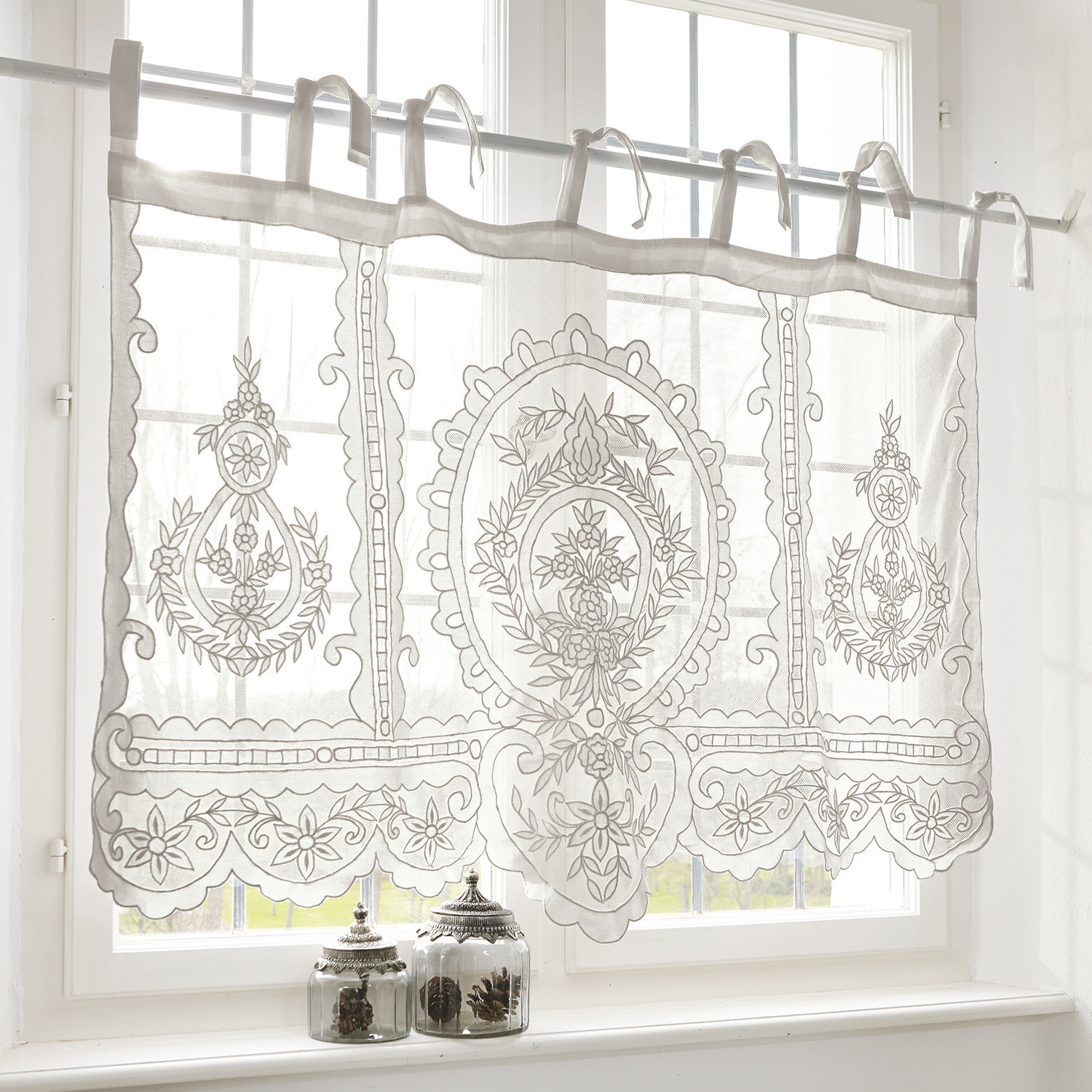 Es ist sicherlich keine Übertreibung, wenn wir behaupten, dass man sich mit dieser Scheibengardine ein echtes Kunstwerk in die eigenen vier Wände holt. Sie ist aus besonders feiner Baumwolle gewebt und mit zauberhaften Stickmustern verziert. Das florale Dessin verleiht der fein gesäumten Kurzgardine einen ganz charakteristischen Charme und erinnert an unbezahlbare Erbstücke aus traditionsreichen Jugendstilvillen. Die Gardine ist transparent genug, um das Licht durchzulassen, schützt aber dennoch vor neugierigen Blicken. Die charmanten Bindebänder sind extra lang, damit man beim Aufhängen etwas Spiel hat.