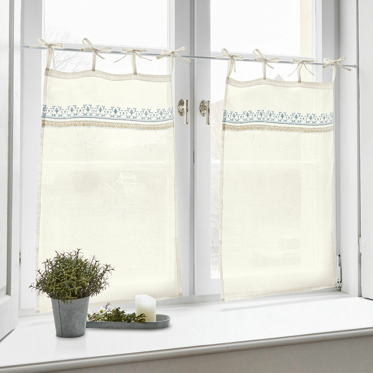 Sie suchen eine Scheibengardine, die Licht in den Raum fallen lässt, neugierige Blicke aber aussperrt? Dann ist duftiger Voile die richtige Stoffwahl. Der Begriff Voile kommt übrigens aus dem Französischen und bedeutet ‘Schleier‘, hat also seinen Ursprung in der noblen Braut- und Hutmode. Und Voile aus reinem Leinen ist einer der schönsten und edelsten Stoffe für hauchzarte Gewebe wie diese Scheibengardine. Sie ist besonders transparent, hat eine glatte Optik, einen leicht körnigen Griff und fällt in wunderschön weichen, eleganten Falten. Ein besonderer Effekt entsteht durch die in dunklem Kontrastfarbton ausgeführte Stickerei, so dass sich die üppigen, floralen Ornamente besonders plastisch von dem zarten Gewebe abheben. Eine Scheibengardine, die mit allen Ausprägungen des klassischen Landhaus-Looks harmoniert und ein Fenster im Wohnraum wie im Schlafzimmer, im Bad oder Gästezimmer ziert. Und das Aufhängen ist im Handumdrehen erledigt, denn die Scheibengardine wird mit vier praktischen Bindebändern befestigt.
