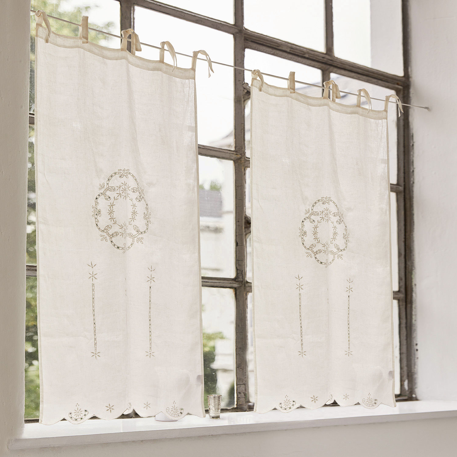 Eine in Handarbeit gefertigte Lochstickerei macht diese Scheibengardine zu einem echten Schmuckstück. Ein senkrecht verlaufender Hohlsaum und Bindebänder oben machen das cremefarbene Stück Stoff darüber hinaus auch zu einem wunderbar praktischen Fensterschmuck. Der leichte Stoff aus reinem Leinen sorgt auch bei tief stehender Sonne für eine angenehme Lichtstimmung im Raum und verleiht Ihrem Zuhause im Handumdrehen Wärme und Gemütlichkeit.