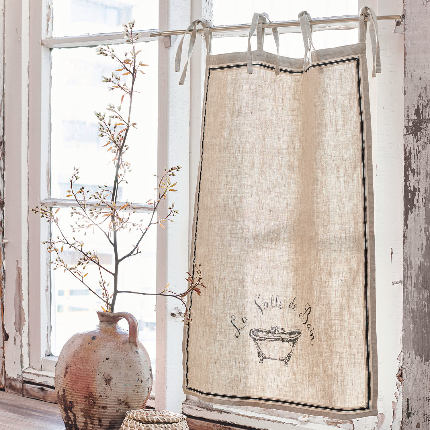Très jolie: Diese hübsche Scheibengardine ist eine wahre Zierde. Sie eignet sich bestens für kleinere Fenster, etwa im Bad oder auch in der Küche. Das Vintage-Motiv ist jedoch perfekt für das Badezimmer geeignet. Der charmante, französische Print und eine edle Streifenbordüre zieren das Design. Es besteht aus reinem Leinen. Dank dekorativer Binderbänder ist die Länge leicht variabel und die Anbringung ganz leicht. Hiermit genießen Sie eine klassische und stilvolle Dekoration sowie einen schmückenden Sichtschutz. Besonders zum Landhaus-Stil setzt das nostalgische Design einen harmonischen Akzent.