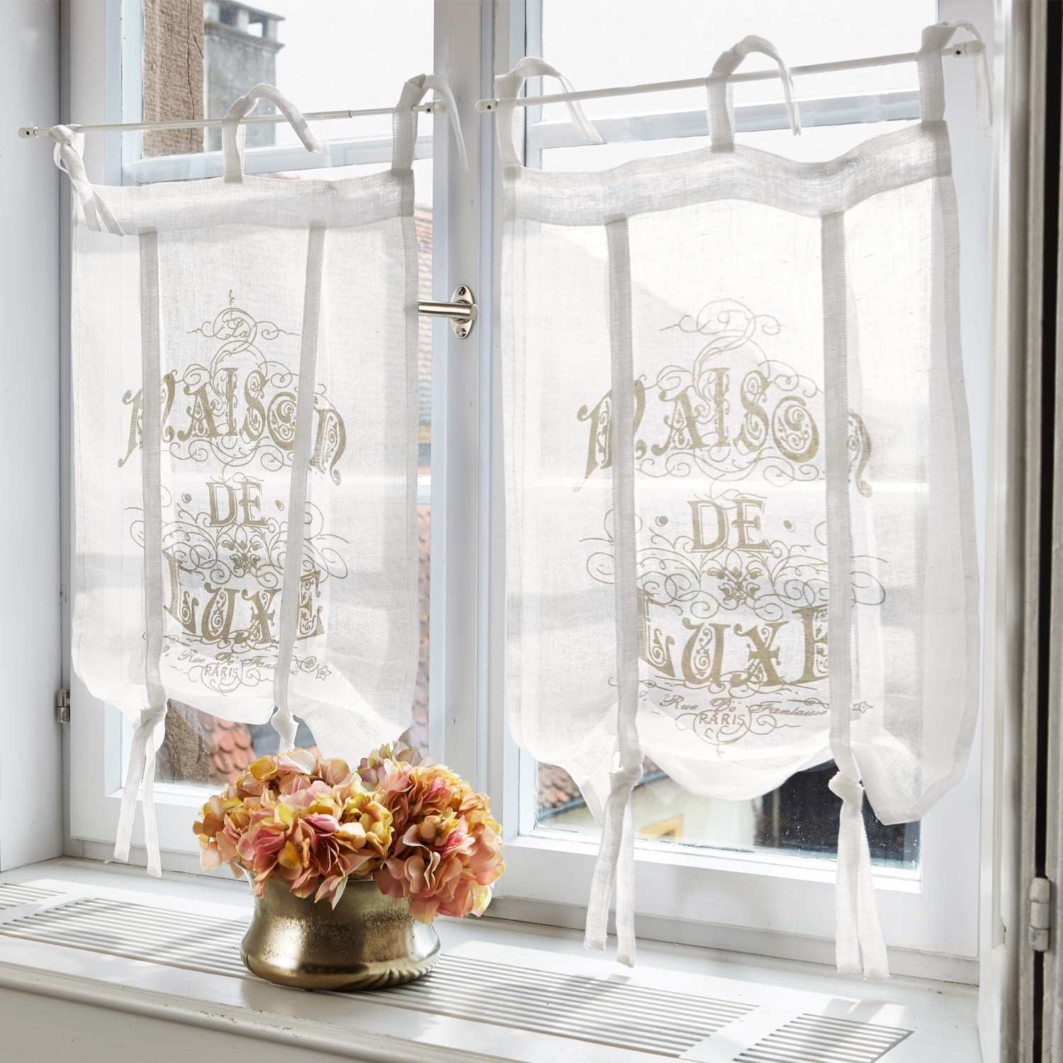 Genießen Sie romantisches französisches Flair. Dieses zauberhafte Wohntextil bringt eine große Portion französisches Lebensgefühl mit sich. Der zarte und romantische Aufdruck mit Vintage-Anmutung lässt an das genussvolle Savoir-vivre unserer europäischen Nachbarn denken. Café au lait, Croissants, ein Bummel durch Paris − so leicht kann man auf eine kleine gedankliche Reise gehen. Das schöne Stück besteht aus hochwertigem, reinen Leinen. Mit raffinierten Bändern lassen sich sehr dekorative geraffte Effekte erreichen. Ein leichter und feiner Sichtschutz, der jedes Küchenfenster ziert und zum Verweilen dort einlädt. Ob beim Kochen oder für eine Kaffeepause am Küchentisch – so wird es dort gleich noch heimeliger. Stilvolle Eleganz, die perfekt mit Landhaus-Stil und Shabby-Chic harmoniert.