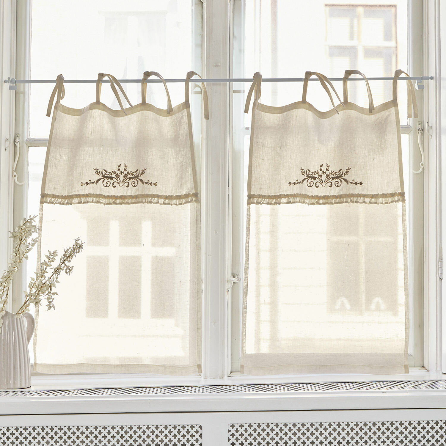 Wünschen Sie sich ein nostalgisches Accessoire wie zu Großmutters Zeiten? Dann ist diese schöne Scheibengardine eine ideale Wahl. Sie besteht aus wertvollem, reinen Leinen und ist mit romantischen Rüschen verziert. Dank der dekorativen Bindebänder lässt sie sich sehr leicht aufhängen. Das hübsche Stück macht sich sehr gut in der Küche, im Bad oder an anderen kleinen Fenstern, wie es sie vielleicht in verwinkelten Altbauten gibt. So schützen Sie sich vor Blicken und setzen zugleich einen sehr charmanten Vintage-Akzent, welcher wunderbar zum Shabby-Chic passt.