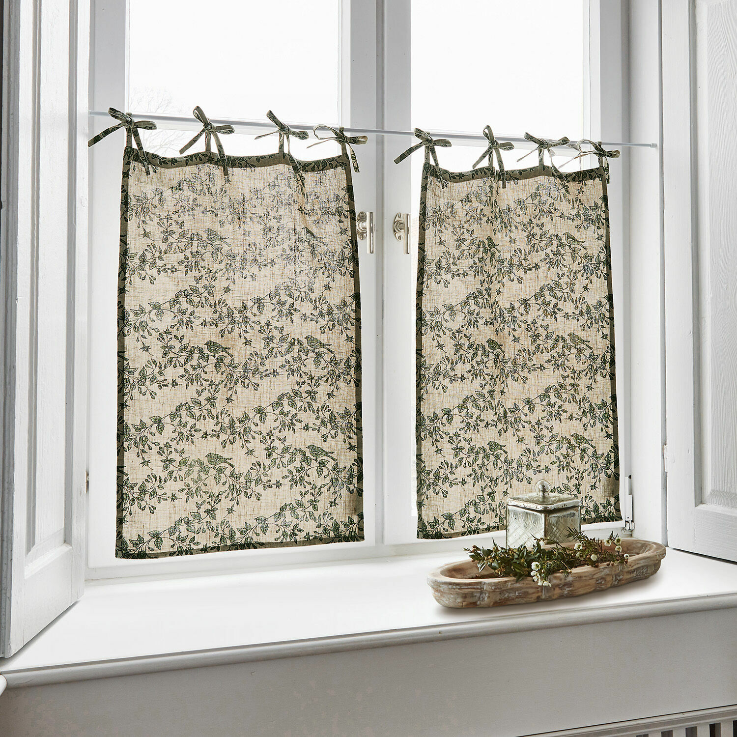 Entdecken Sie die stimmungsvolle Raumwirkung, die diese edle Scheibengardine hervorruft. Der wunderschöne Print auf der Vorderseite zeigt Blätter, Ranken und zauberhafte Vögel im gelungenen Zusammenspiel – Romantik pur für Ihr Fenster. Als Basis für die lebendige Szenerie dient reines Leinen. Das Gewebe mit seiner typischen unregelmäßigen Struktur strahlt eine edle Natürlichkeit aus und ist geschmeidig im Fall. Vor dem Fenster schützt die Gardine vor neugierigen Blicken und trotzdem lässt sie das Licht sanft durchschimmern. Abgerundet durch vier lange Bindebänder kann sie dekorativ an die Vorhangstange angebracht werden. Ein behaglicher Akzent, der auch Ihren Küchenkräutern oder Dekostücken auf dem Fensterbrett ausreichend Freiraum gewährt. Mit dem Landhaus-Stil harmoniert das Textil wunderbar.