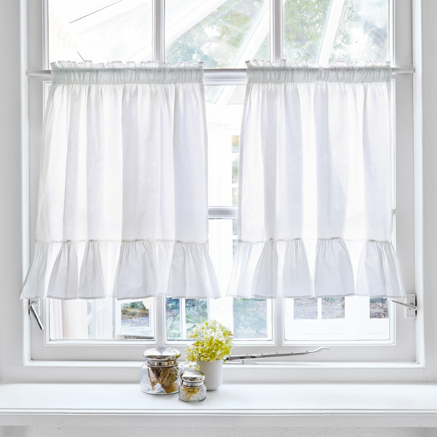 Wenn Sie ein romantisches Wohnambiente lieben, sollten Sie diese Scheibengardine in die Raumgestaltung mit einbeziehen. Sie ist ein hübscher Blickfang und verleiht Ihrem Fenster einen unverwechselbaren Ausdruck, ohne sich in den Vordergrund zu drängen. Dabei setzen verspielte Rüschen am oberen und unteren Saum den schmückenden Akzent. Das natürliche Gewebe aus reiner Baumwolle ist weich fließend und fein genug, um das Tageslicht angenehm mild durchscheinen zu lassen. So bewahrt der Raum seine Helligkeit und Ihre Pflanzen oder besonderen Dekostücke auf dem Fensterbrett erhalten ausreichend Freiraum, um sich wirkungsvoll in Szene zu setzen. Dank einem Tunnelsaum lässt sich das Textil ganz unkompliziert auf die Vorhangstange aufziehen und auf Wunschhöhe am Fenster anbringen. Ein stimmungsvoller Dekoakzent für traumhafte Küchen oder Badezimmer.