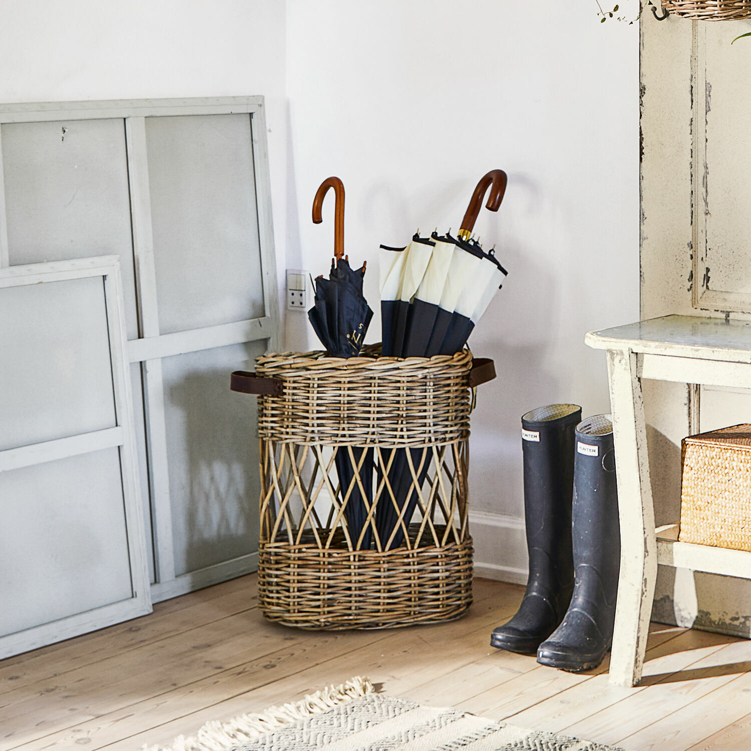 Praktische Alltagsbegleiter wie der Regenschirm sind in jedem Haushalt unverzichtbar und verlangen nach einer stilvollen Aufbewahrung. Dieser Schirmständer aus natürlichem Rattan sorgt nicht nur für jede Menge Platz, sondern ist auch ein äußerst dekorativer Blickfang in Ihrem Eingangsbereich. Dabei macht die individuelle, handgeflochtene Fertigung aus jedem Stück ein Unikat. Rattan ist eines der ältesten und beliebtesten Materialien, die die Natur zu bieten hat. Kein Wunder, zeichnet es sich doch durch seine lange Lebensdauer, Robustheit und Leichtigkeit aus. Als schnell nachwachsender Rohstoff wird Rattan auch dem Thema Nachhaltigkeit gerecht und ist daher in der Interieurwelt gefragter denn je. Zwei Tragegriffe aus echtem Büffelleder runden das Gesamtbild gelungen ab. Da das Material nicht zu viel Wasser verträgt, sollten Sie den nassen Schirm erst trocknen lassen, bevor Sie ihn in den Ständer stellen. In ländlichem Ambiente macht das Wohnaccessoire eine besonders gute Figur.