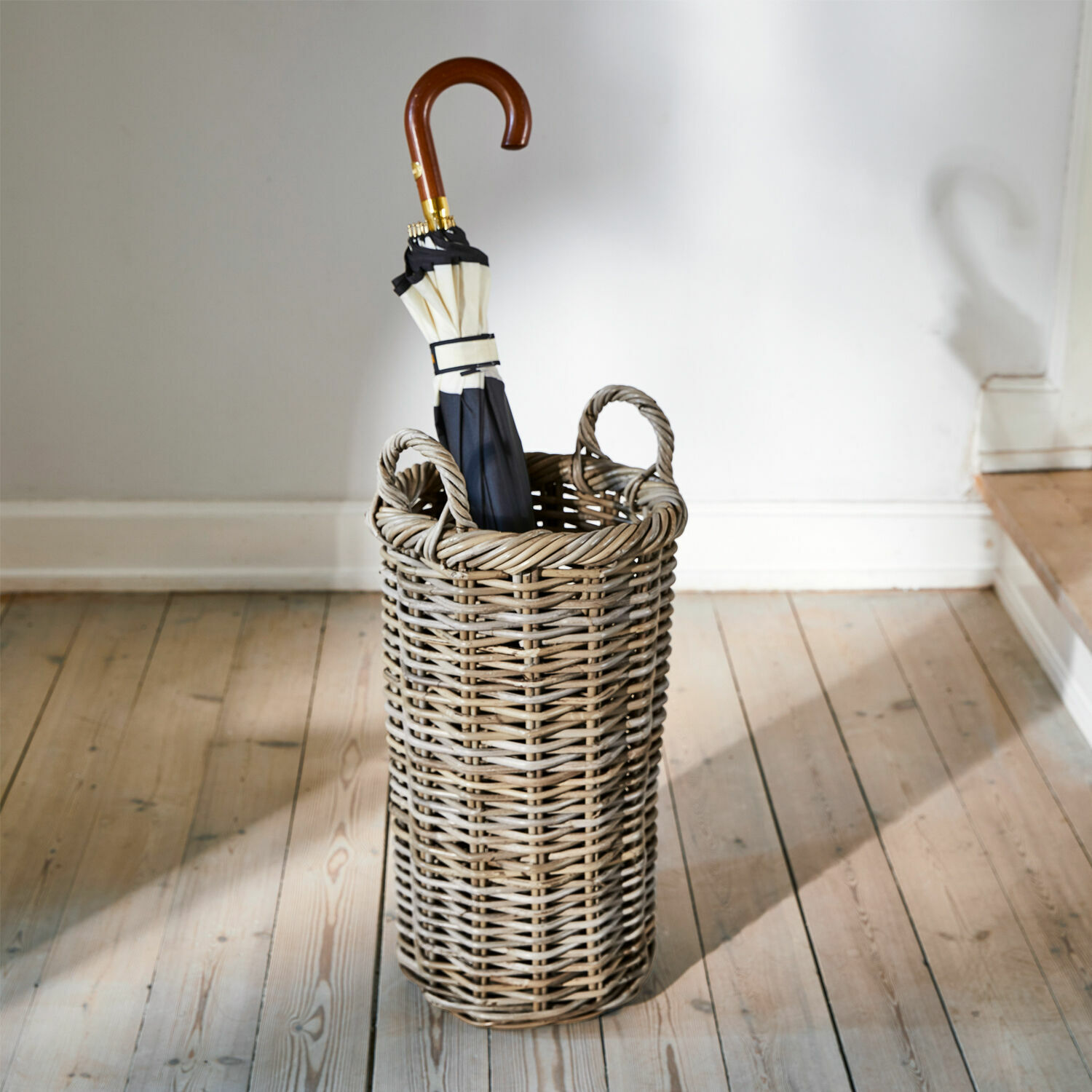 Ein natürliches Accessoire mit zeitlosem Charme – dieser formschöne Schirmständer aus Rattan hat klassisches Flair. Er ist von Hand geflochten und besteht aus einem nachhaltigen Naturmaterial. So tun Sie etwas Gutes für die Umwelt und schaffen zudem ein angenehmes Wohnklima. Das schicke Accessoire ist pflegeleicht, langlebig und stabil. Hier lassen sich Regenschirme, die vorher etwas abtropfen sollten, Stöcke zum Nordic Walking oder auch Gehhilfen praktisch und dekorativ verstauen. Im Flur oder am Eingang zur Tür macht das attraktive Design sich bestens. Dieser hochwertige Schirmständer passt sehr gut zum Landhaus-Stil.