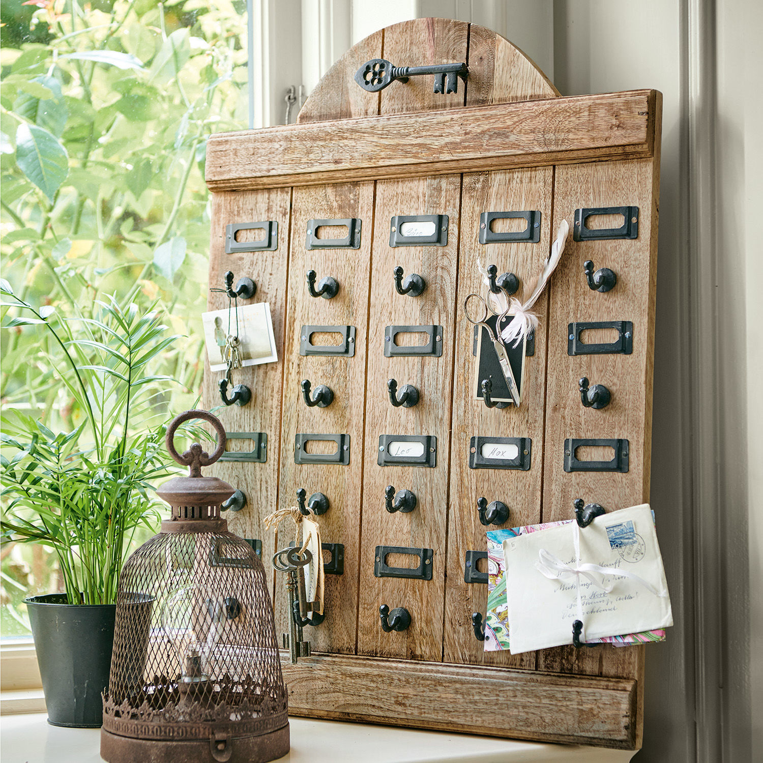 Für die Herstellung dieses außergewöhnlich hübschen Schlüsselboards wurde ausschließlich Mangoholz gewählt, da es eine besonders attraktive Maserung aufweist. Die feine Struktur des hochwertigen Naturmaterials kommt durch ein dezentes Antik-Finish perfekt zur Geltung und passt hervorragend zum natürlichen Charakter des Landhaus-Stils. Man könnte wirklich meinen, dass dieses Stück mehrere Jahrzehnte überdauert hat. Das liegt natürlich auch an den charmanten Schilderhaltern und Schlüsselhaken, die aus antik patiniertem Eisen gefertigt wurden. Die Haken lassen sich also ganz einfach kennzeichnen und Schlüssel und Utensilien griffbereit verwahren. Der ausgeprägte Landhaus-Charakter harmoniert nicht nur mit Vintage-Interieurs, sondern auch mit Wohnkonzepten unterschiedlichster Art.