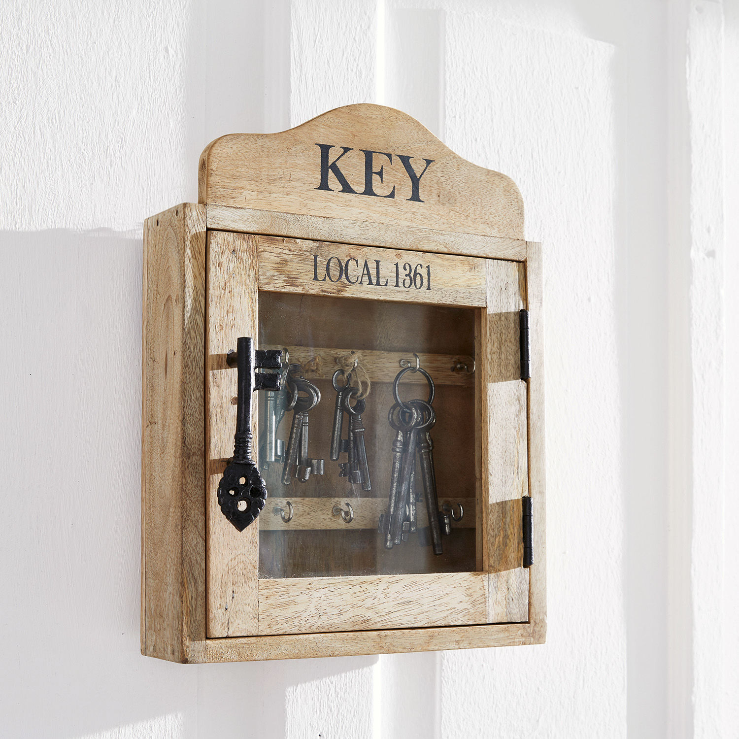 Sie möchten ihre Schlüssel sicher und stets griffbereit aufbewahren? Dann empfiehlt sich dieser charmante Schlüsselkasten aus natürlich schönem Mangoholz. Das rustikale Design hat einen zeitlosen Charakter, der nie aus der Mode gerät. Ein Aufdruck, so wie auch der zu einem antiken Schlüssel geformte Griff aus Eisen machen deutlich, was hier aufbewahrt werden soll. Auf insgesamt 8 Haken bringen Sie all Ihre kleinen und großen Schlüssel unter und haben Sie beim Verlassen des Hauses immer schnell griffbereit. So werden Sie nie wieder einen benötigten Schlüssel in der Wohnung zurücklassen. Und beim Betreten der eigenen vier Wände lädt das hübsche Kästchen gleich dazu ein, Ordnung zu halten. Besonders das natürlich gemaserte Mangoholz ist hierbei wirklich hübsch anzusehen. Es ist äußerst robust, sodass das Hantieren mit den Schlüsseln kaum Spuren hinterlässt.