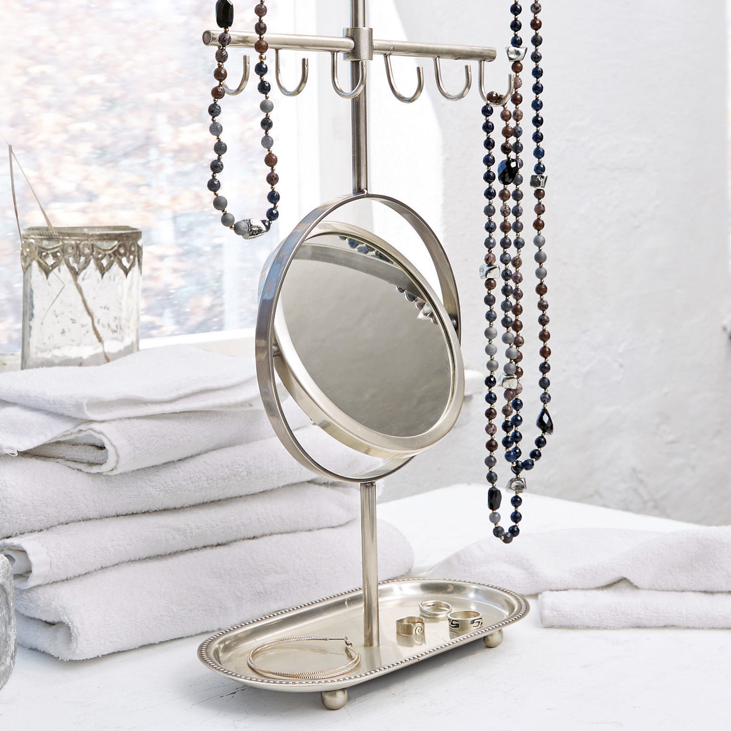 Ein perfekt durchdachtes Design mit eleganter Optik. Der schicke und hochwertige Schmuckhalter bietet viele Haken, deren Anordnung auch wohl durchdacht ist. So lassen sich lange Ketten an der obersten Stange prblemlos aufhängen, ohn den Boden zu berühren. Die kleinere Stange darunter eignet sich hervorragend für Ohrringe oder kurze Armbänder. So haben Sie Ihre Schätze immer im Blick und gleich griffbereit. Am darunter angebrachten Spiegel lässt sich der Sitz gleich kontrollieren, und auch das Schminken macht hier Spaß. Der Spiegel lässt sich flexibel drehen. Die untere Ablage bietet zudem Raum für Uhren, Ringe und mehr. Oder legen Sie hier bereits am Abend das heraus, was Sie am nächsten Tag gerne tragen möchten. Der Schmuckhalter macht auf dem Schminktisch oder einer Kommode eine sehr gute Figur und ziert jedes Ambiente. Im Fuß wurde schweres Eisen verwendet, das für einen sicheren Stand sorgt. Wer sich gerne hübsch macht, wird dieses nützliche und dekorative Accessoire mit leicht nostalgischer Note lieben – so macht Ordnung halten richtig Freude.